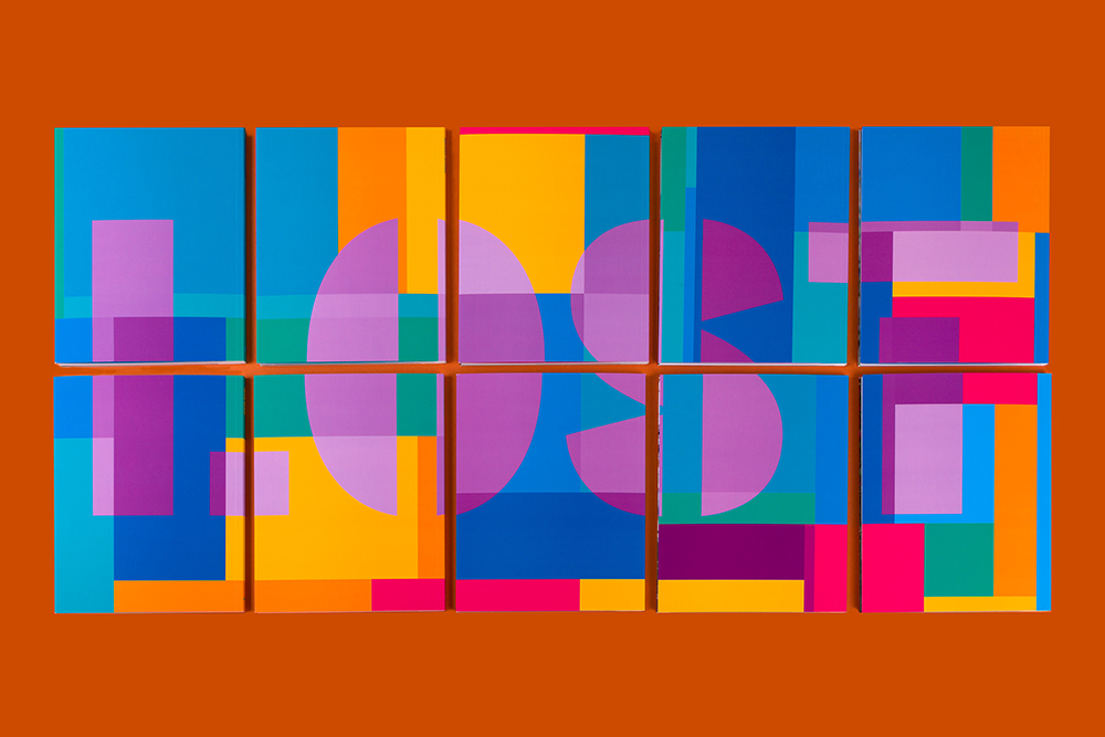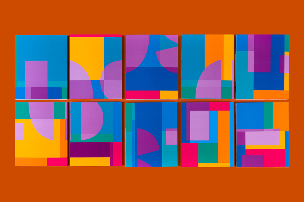 Peter Baker, Yoav Horesh, Melissa Alcena, Melody Melamed, Tracy Dong, KGP) comprises of ten books that showcase the works of artists exploring themes such as gender, class, racism and contemporary culture. Each book features a single artist with a full bleed cover and a varying strip of color. The artist’s name appears in bold type that changes in visibility based on the light. The back covers have different color blocks and when all are line up in the correct order, they spell lost, giving a bit of joy in creating something legible from abstract shapes while referencing maps.