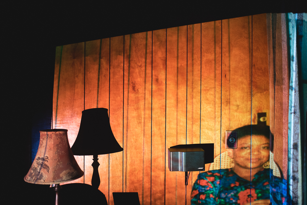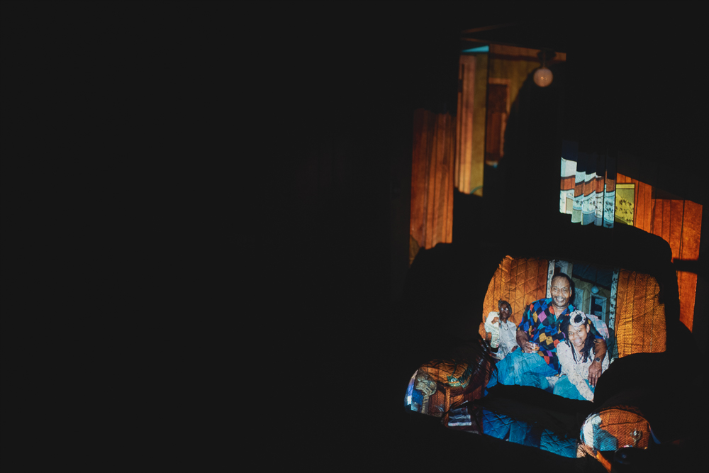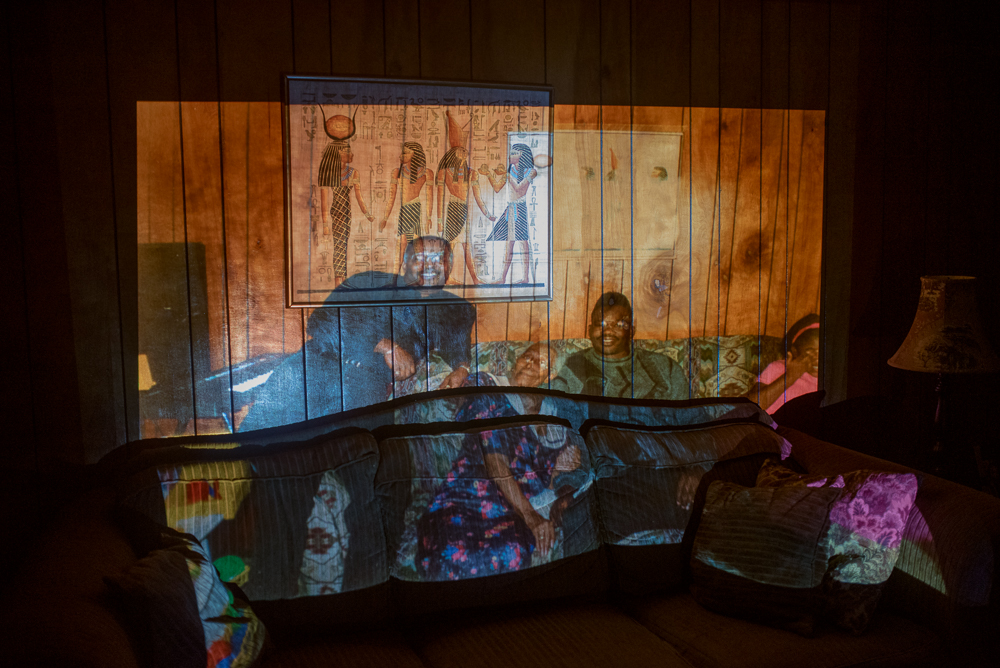 © Rachel Elise Thomas, All in the Family (Crowded House), 2022. From Thomas: The projected image that was initially taken in the family room is special to me because it is the only image that exists with (from left to right), my dad, great-grandmother, uncle, and myself in it. Interestingly, the framed hieroglyph artwork that hangs over the couch had been in the same place for over thirty years.