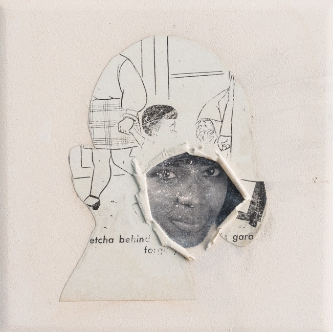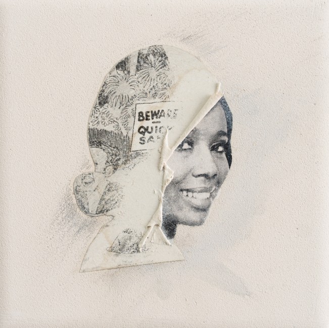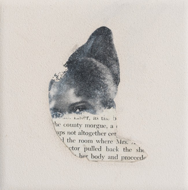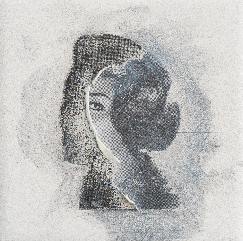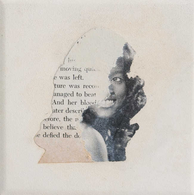 © Rachel Elise Thomas, Dismantle Beauty, 2025. From Thomas: The definition of dismantle means: to disassemble or pull down; take apart, to disconnect the pieces of, to destroy the integrity or functioning of. I take satisfaction in altering the appearance of women from different advertisements through the process of doing image transfers. I specifically select images from Black American publications where the women in the advertisements are seen as the epitome of beauty, adorned with the best cosmetics, wigs and different hairstyles from a time long ago. During the process of rubbing and peeling the paper of each image transfer, the ink on the surface beautifully stains the tile as I carefully reveal what’s underneath. Each outcome unpredictable and diverse–further illustrating that Black women are not a monolith. My decision to do image transfers on ceramic tile was intentional, associating the complexity and depth that I associate with being a Black woman–metaphorically, the 4″x4″ ceramic tile is fragile, meant to be handled with care, but also stable enough to withstand friction.