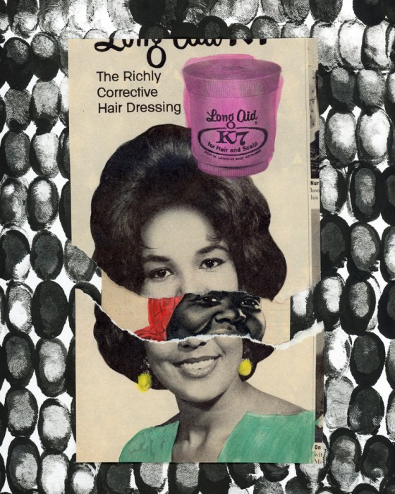 © Rachel Elise Thomas, Mammy Archetype, 2022. From Thomas: My fascination with Aunt Jemima stems from a particular incident where I was likened to the pancake mascot by a white coworker. Like the character, I was wearing a head wrap, but this comparison was also made due to me being a dark-skinned Black woman with a full-figured physique. This inspired me to reclaim the narrative of a humiliating situation and assert my empowerment by creating the collage named Mammy Archetype. This collage delves into themes of desirability; colorism and societal standards of beauty–emphasizing my personal connection to this artwork, I incorporated my repeated thumbprint multiple times throughout the background as a form of self-portraiture, further likening myself to the subject matter.