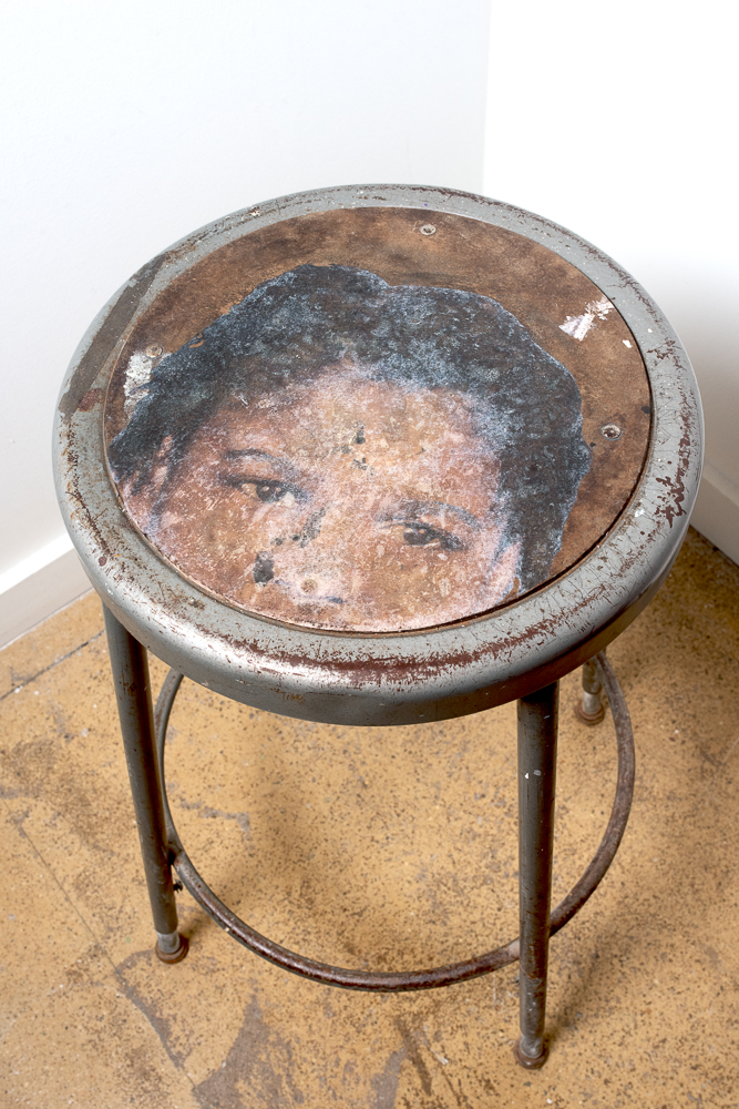 © Rachel Elise Thomas, Picture Day, 2024. From Thomas: This stool features an image transfer of myself, taken on picture day in kindergarten (1993–1994). I deliberately chose this picture to transfer because I wanted my brown skin to seamlessly merge with the stool’s fiberboard material. I’ve observed multiple people either place a box, coat, or accidentally sit on the stool, without noticing the image of my face. In my childhood, I harbored a desire to become invisible, not out of embarrassment or shyness, but out of mischievous curiosity to observe unnoticed–as an adult, I involuntarily became invisible in a different way. My brown skin, a color often overlooked or erased in mainstream representation, made it easy for my face to fade into obscurity.