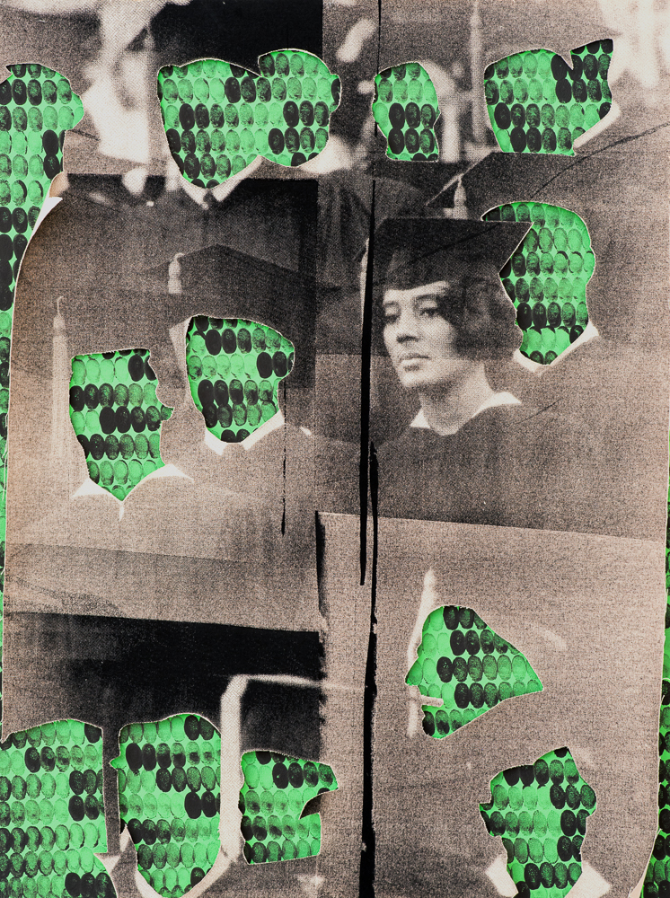 © Rachel Elise Thomas, University of Alabama 1965, 2024. From Thomas: Vivian Malone Jones made history on May 30, 1965, as the first Black student to graduate from the University of Alabama, which was formerly segregated. Despite her academic achievements in high school and membership in the National Honor Society, Jones was initially denied admission to UA due to supposed “enrollment issues” or “class size”. Throughout her time at UA, Jones faced threats, intimidation, and extra security measures for her safety. This difficult journey is evident in the graduation day photo where Jones appears solemn among a sea of white peers, reflecting her exhaustion and desire to move on with her life. The artwork from my graduate thesis illustrates my fascination with Black Americans who were among the first to attend predominantly white institutions. Comparing my own journey as a minority in these environments, I shed light on the challenges of being a Black student in the pursuit of higher education, emphasizing the isolation often experienced.