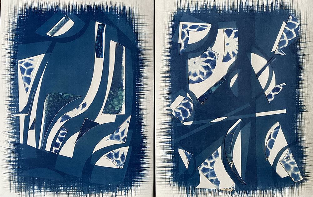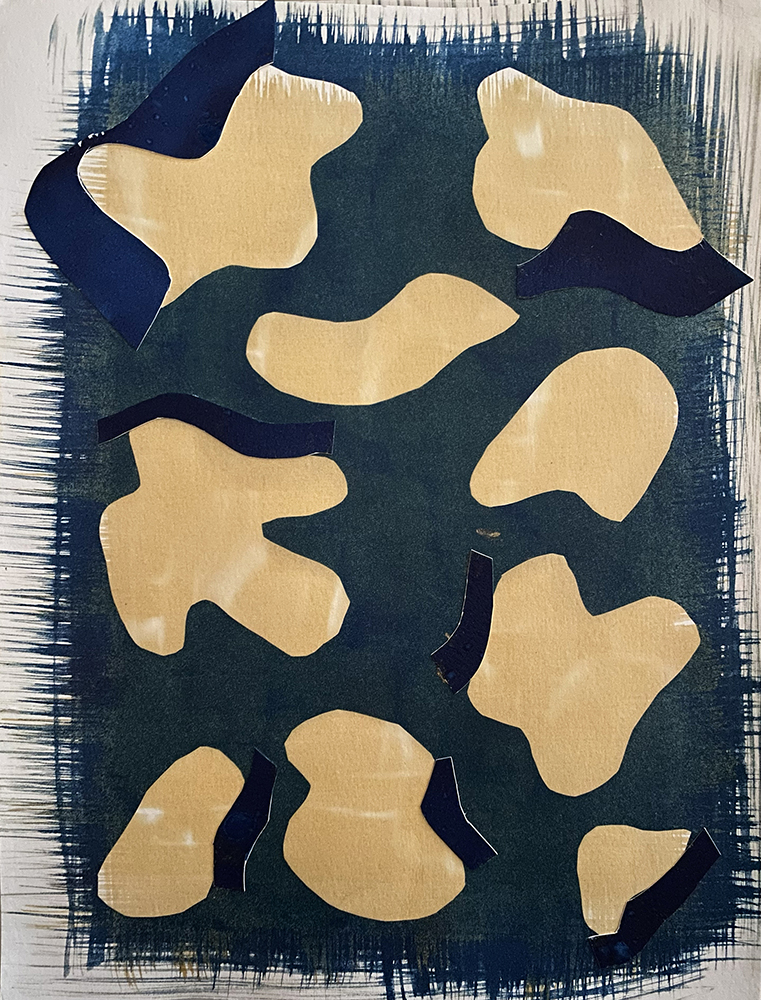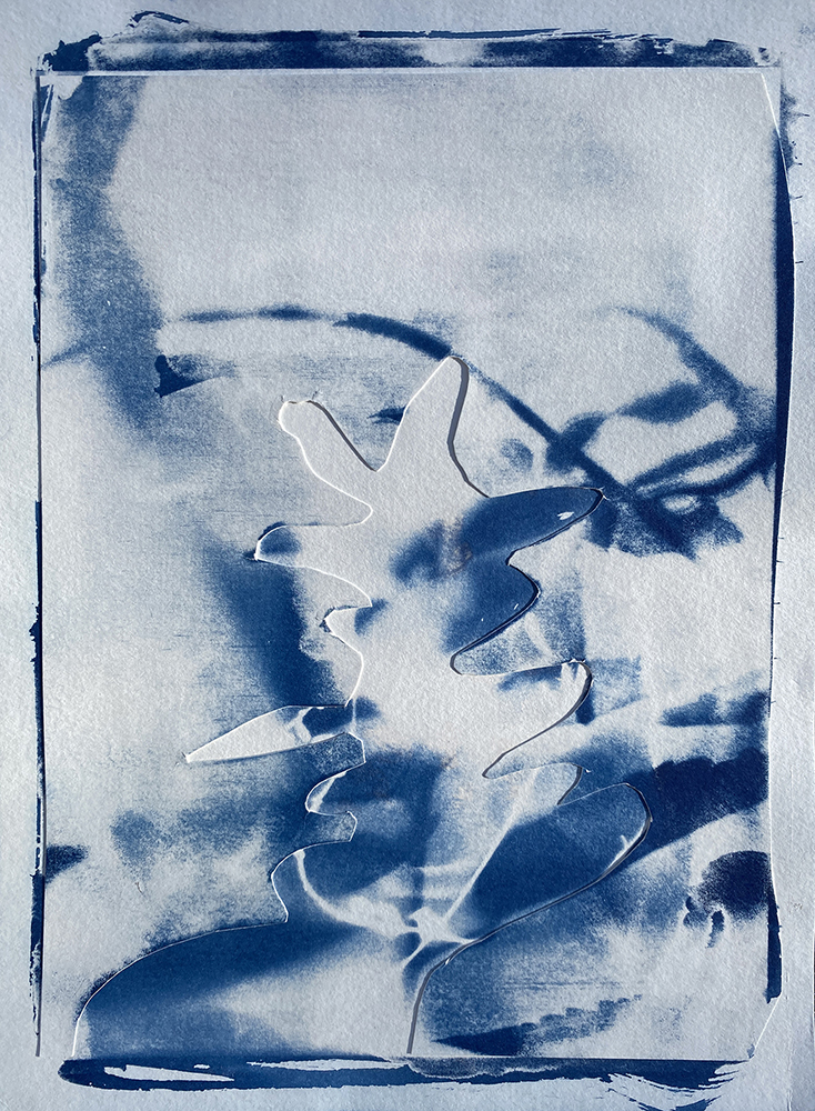 My current work with alternative processes embraces experimentation through a tactile, hands-on approach. It involves sorting, cutting, and reassembling repurposed cyanotype prints, allowing me to shift the original concept into a new, unexpected direction. As I engage with these materials, I seek balance and tension between shapes and colors, toying within the layers to create dynamic compositions. These prints move beyond literal representation, focusing instead on a softer, more painterly quality that leans toward abstraction and invites a sense of mystery.
