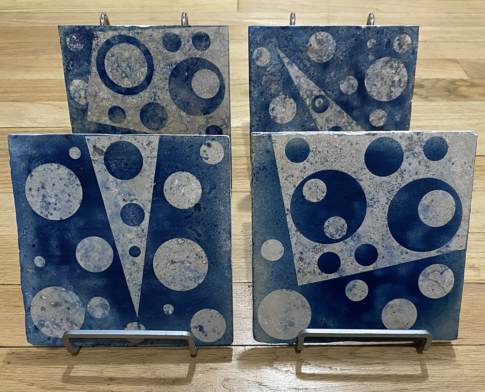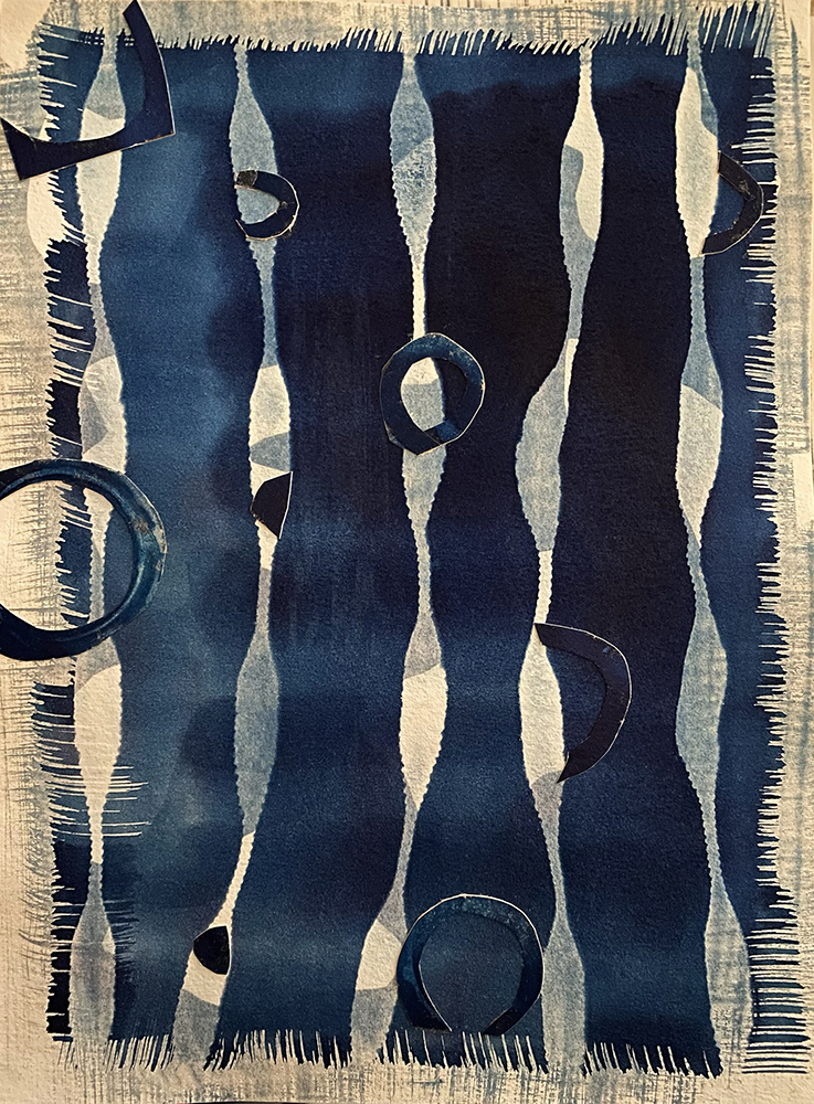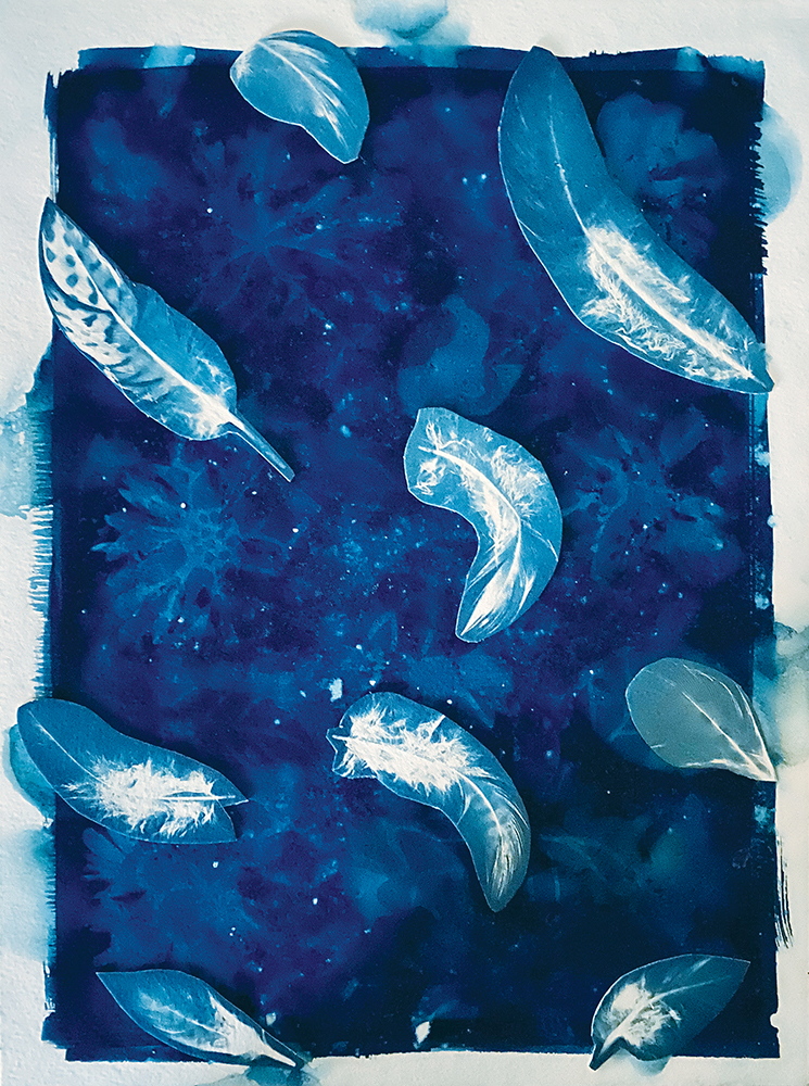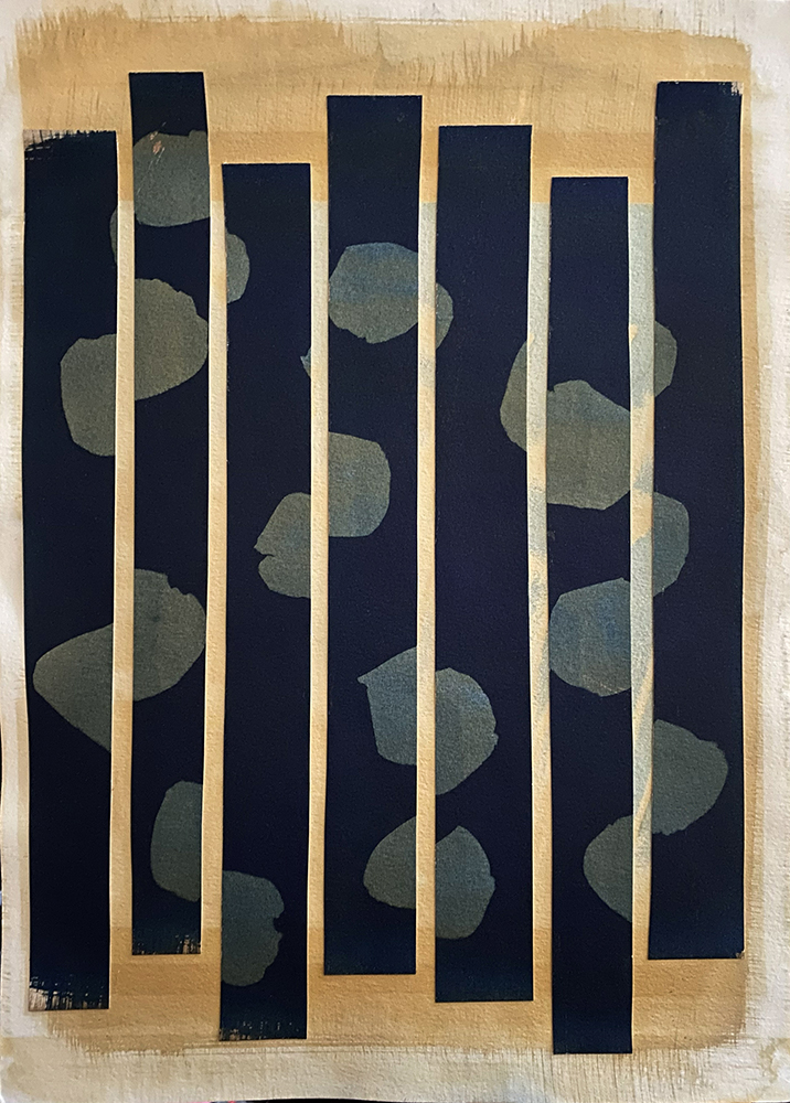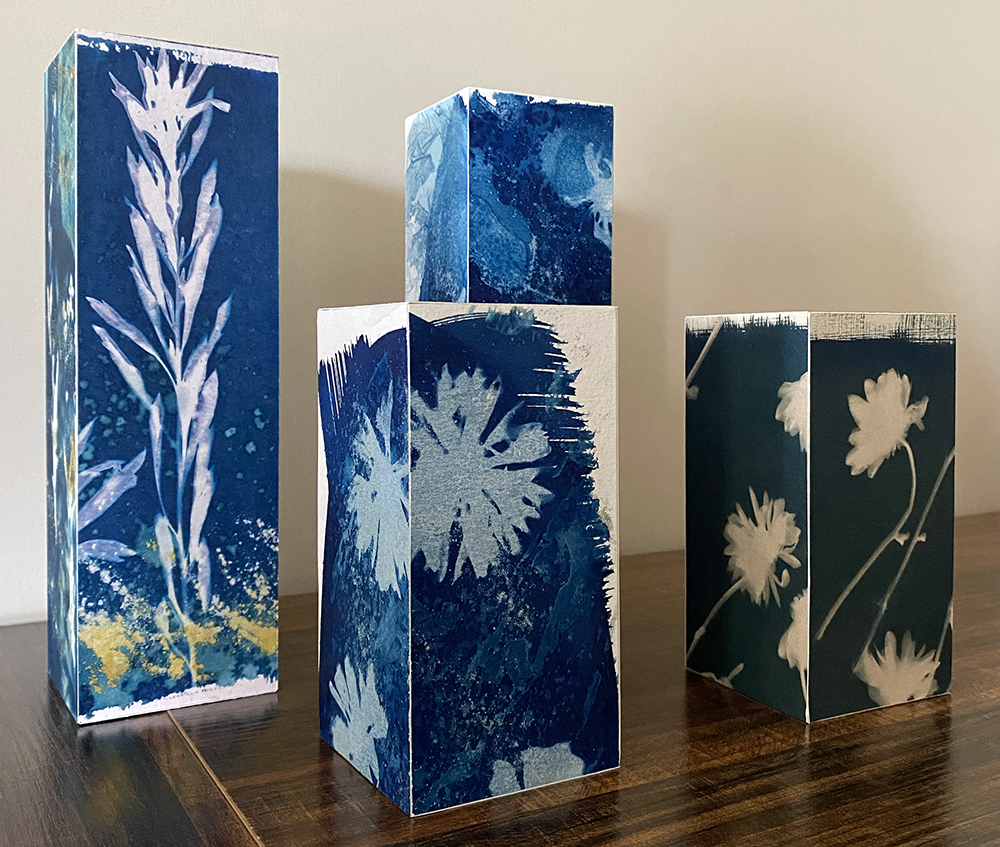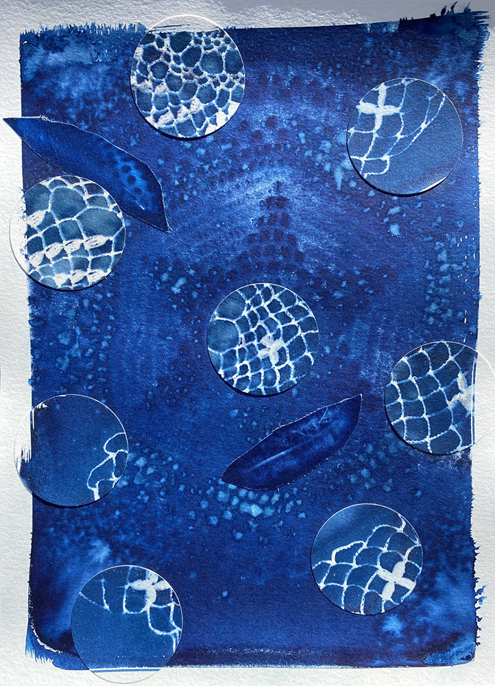 I began as a traditional photographer using film and the darkroom. Digital photography allowed me more freedom to produce images while I cared for my two children during their younger years. In some ways, I feel like I’ve come full circle, layering cyanotype chemistry onto various substrates, but a good part of the steps are camera-less.