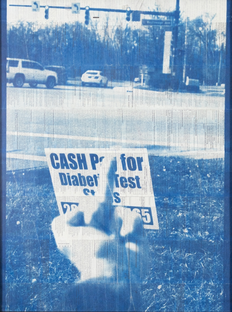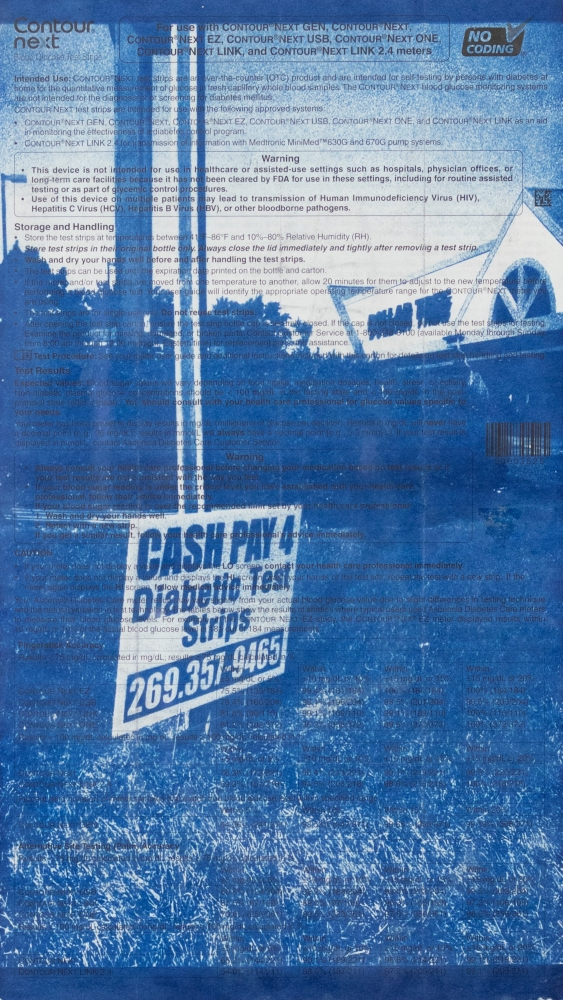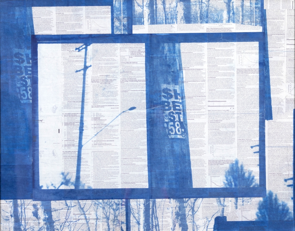 © Pauly V., Lesman’s Market, film photography and cyanotype on insulin fact sheets and corrugated plastic, 22 x 28 inches, framed. Image: A medical insert pamphlet with small informative text on the medical supplies. Printed over the text in cyanotype is a collage of images featuring telephone poles with signs to buy diabetic medical supplies.