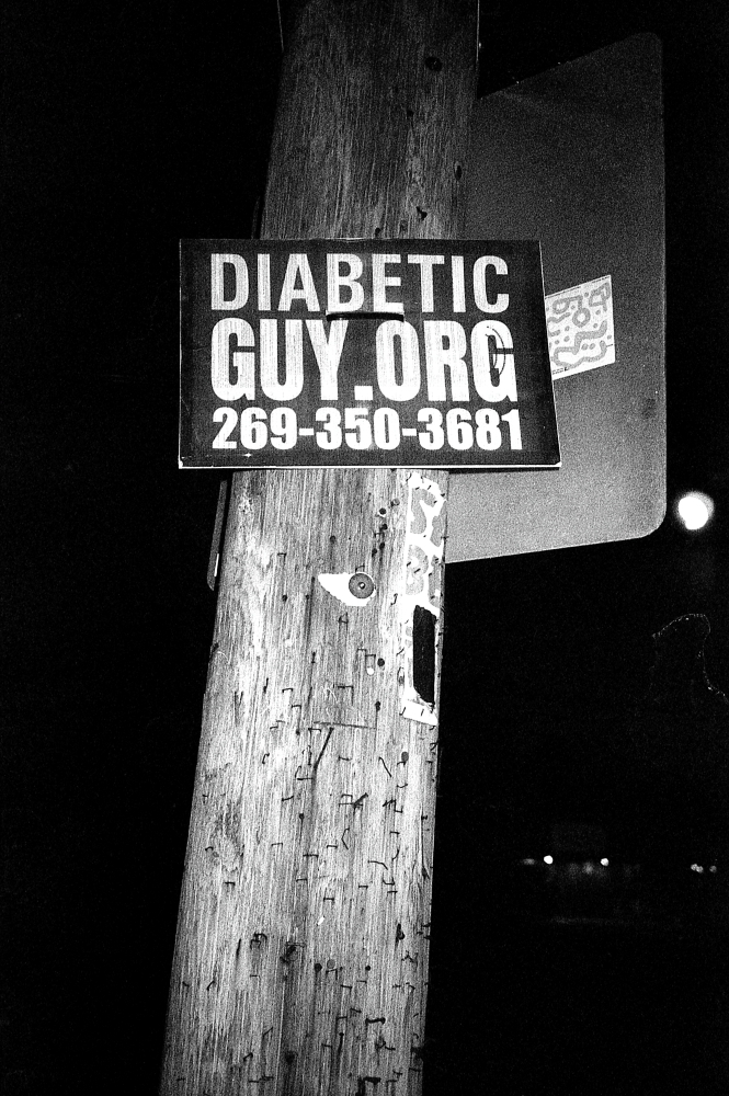 © Pauly V. DIABETICGUY.ORG, black and white film photography, Nikon Action Touch camera, Fomapan 400 film developed in caffenol. Image: A black and white photo of a telephone pole. On the pole is a sign with similar font and design of the Cash 4 diabetic test strip signs, but this sign says “DiabeticGuy.Org”, Pauly’s website.