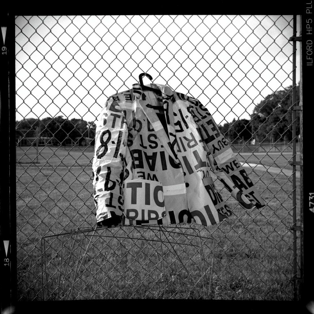 © Pauly V., Jacket, black and white film photography. Lubitel 2 camera, Ilford HP5+ film (pulled 2 stops) developed in caffenol. Image: A black and white photo of a coat on a hanger hanging from a wire fence. The coat is made out of the “Cash 4 Diabetic Test Strip” signs.