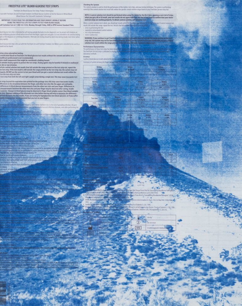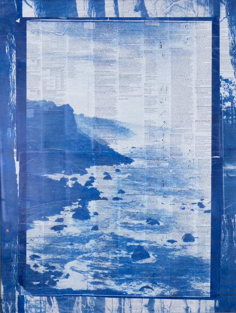 © Pauly V. Pacific, S. of the Klamath, film photography and cyanotype on diabetic fact sheets and corrugated plastic, 34 x 26 inches, framed. Image: A medical insert pamphlet with small informative text on the medical supplies. Printed over the pamphlet in cyanotype is a landscape of rocky shoreline.