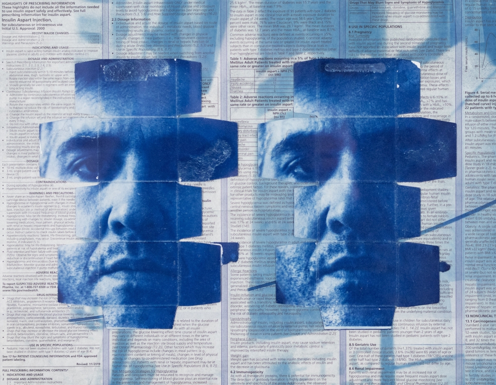 © Pauly V., Self Portrait (2), film photography a cyanotype on diabetic test strip boxes and insulin fact sheets, 11 x 14 inches, framed. Image: A medical insert pamphlet with small informative text. Collaged on top are two flattened medication boxes that have been coated in cyanotype. On each box, Pauly has printed a close-up self-portrait, a white male with eyes in shadow and a close-shaven beard.