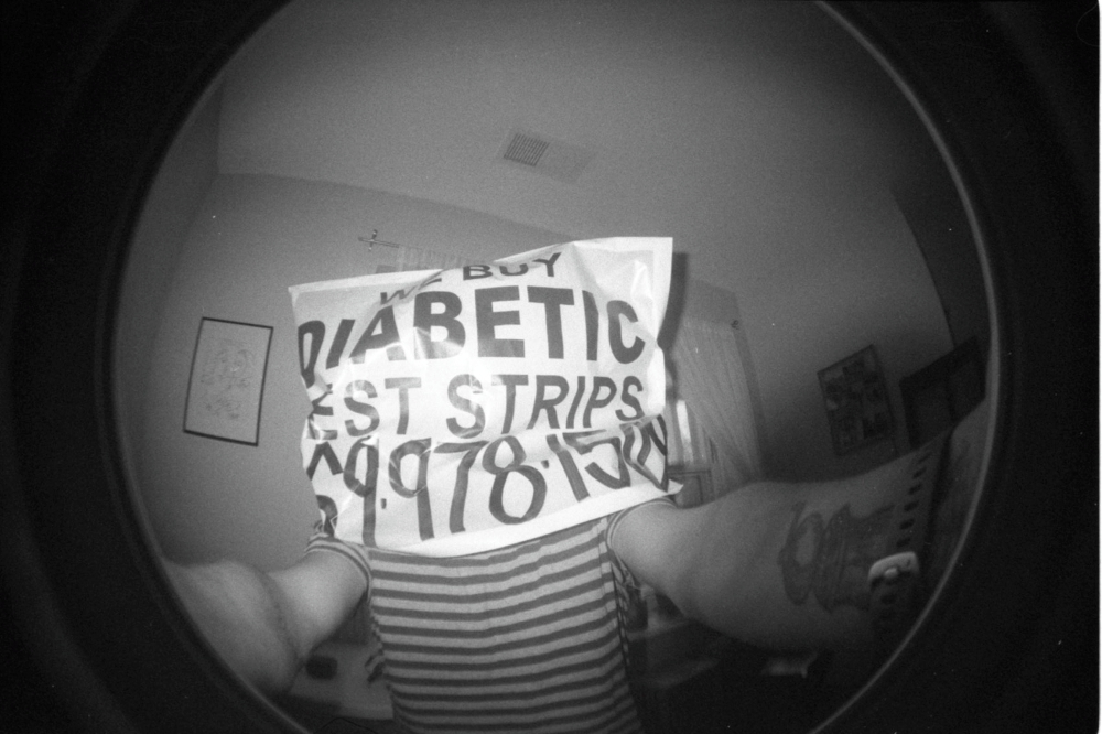 © Pauly V., Self Portrait (4), black and white film photography. Lomography Fisheye 2 camera, Kentmere Pan 400 film, developed in caffenol. Image description: A black and white photo with a fisheye lens. Pauly’s arms are outstretched, holding the camera pointed at himself. He is wearing a striped shirt. Over his face is a sign “ Diabetic Test Strips” with a phone number.