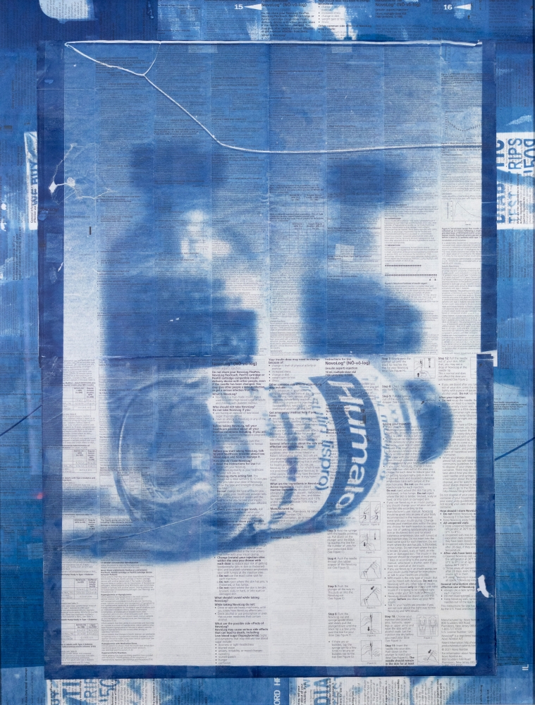 © Pauly V., Vials (1), film photography and cyanotype on insulin fact sheets and corrugated plastic, 34 x 26 inches, framed. Image: A medical insert pamphlet with small text and photos instructing how to self-inject insulin and information about the medication. Printed over the insert in cyanotype is a photo of 3 insulin vials. Around the border of the pamphlet are smaller photos of signs to buy diabetic medical supplies from folks.