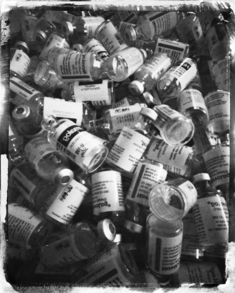 © Pauly V., Vials (2), pinhole photography on direct positive paper, developed in 20 ml insulin, 5 x 4 inches Image: A black and white photograph of a pile of empty vials of insulin.