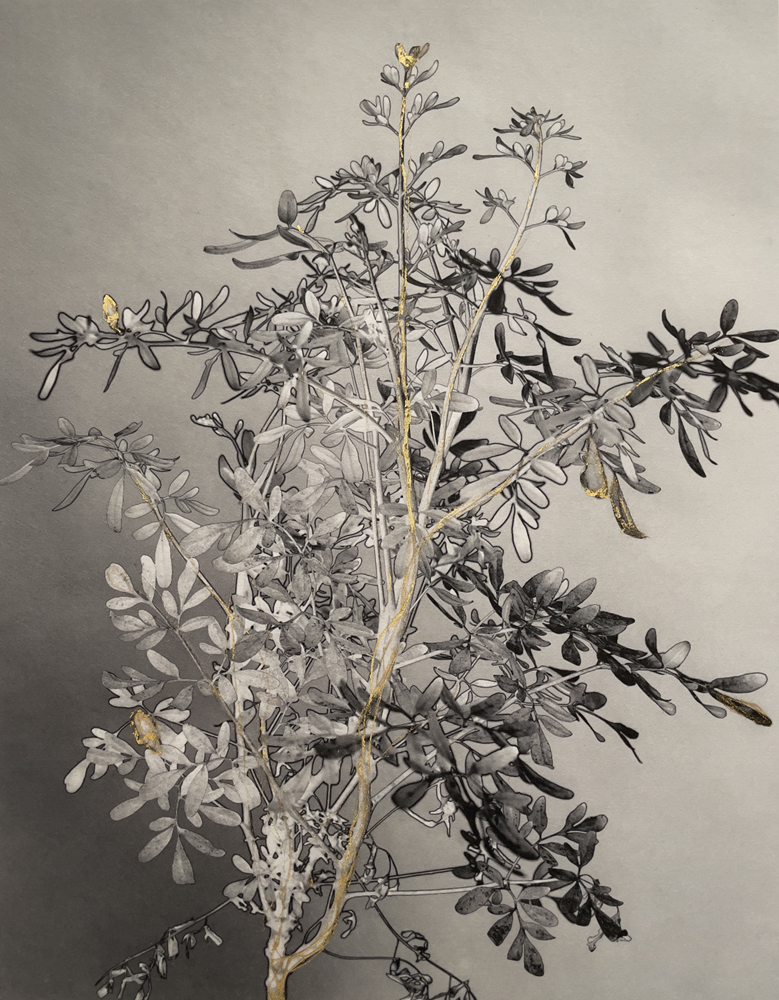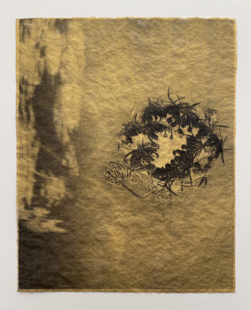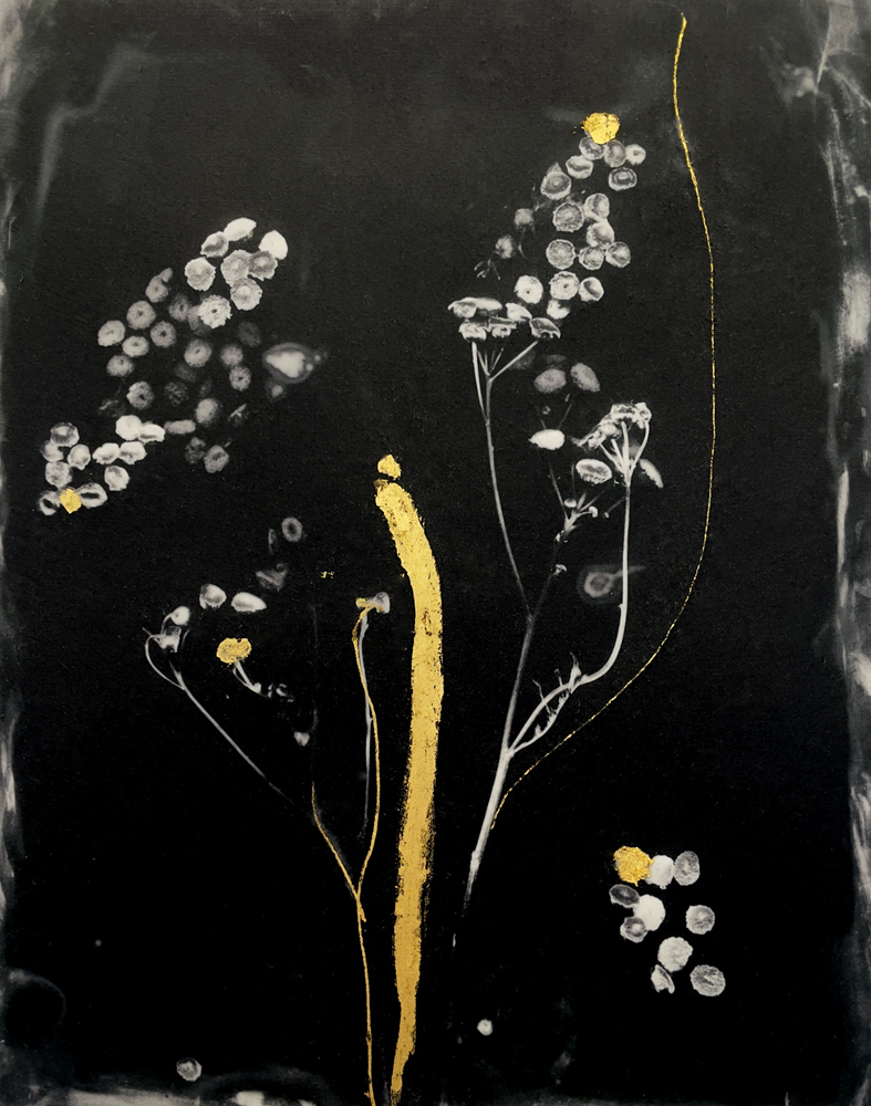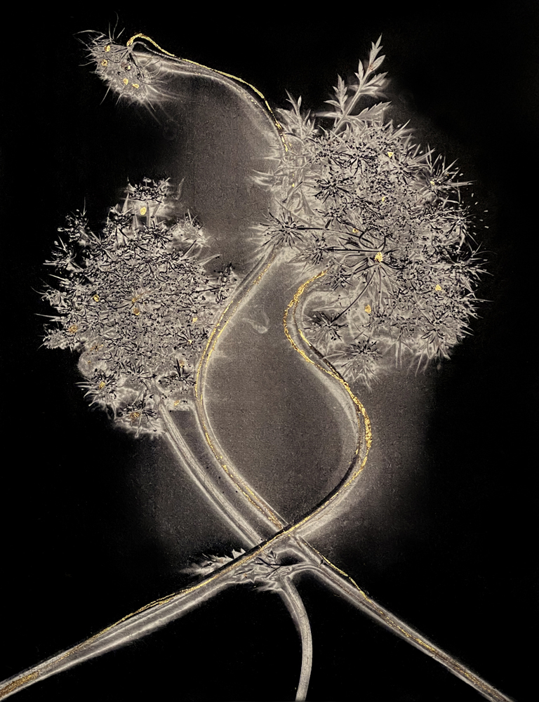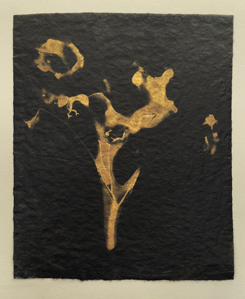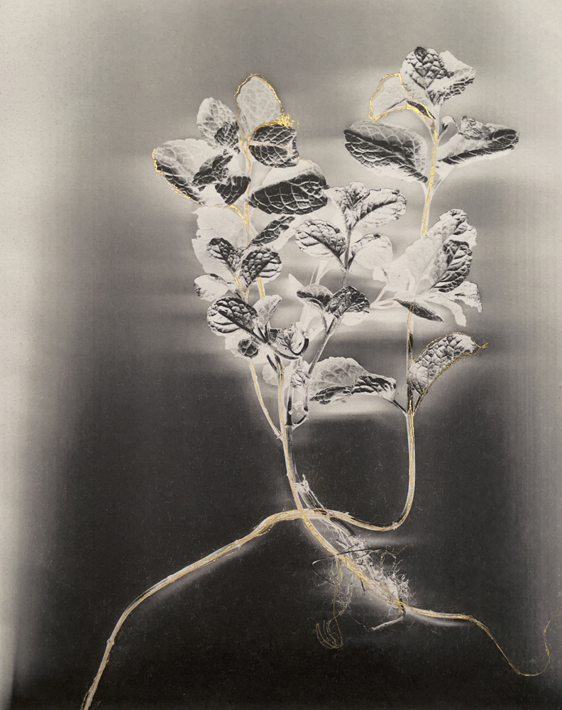 The materials and process for this work were chosen carefully. In chapter 1, the images are printed on Kozo paper, which is known for its delicacy and strength, and that acts as a metaphor for women and this issue. I have applied 24k gold leaf to parts of the prints, which is symbolic of hope, especially for those affected by abortion restrictions. The gold is also a nod to the practice of kintsugi, where gold is used to mend broken ceramics, and is known symbolically for its strength and resilience. In chapter 2, many of the images were created with the phytogram process, a process where the plant chemistry helps create and develop the image, some of the same chemistry that was historically used as part of an abortifacient. The prints were made as inkjet or toned cyanotypes on a delicate washi paper, that are backed with 24k or 18k gold leaf and varnished. The gold again acts as a symbol of hope.
