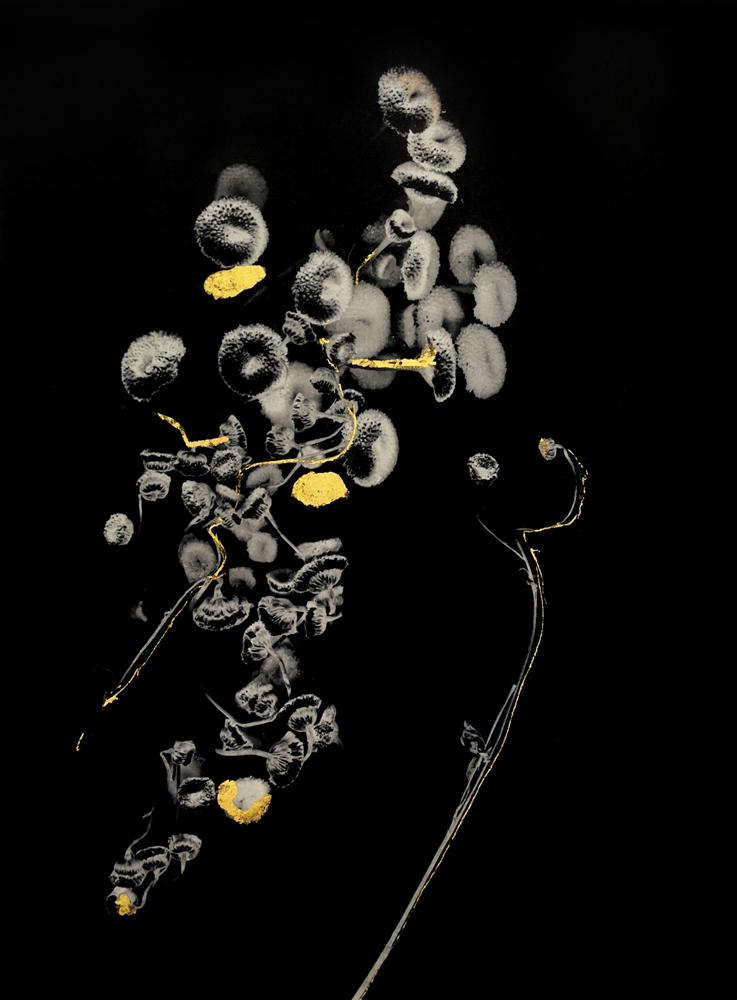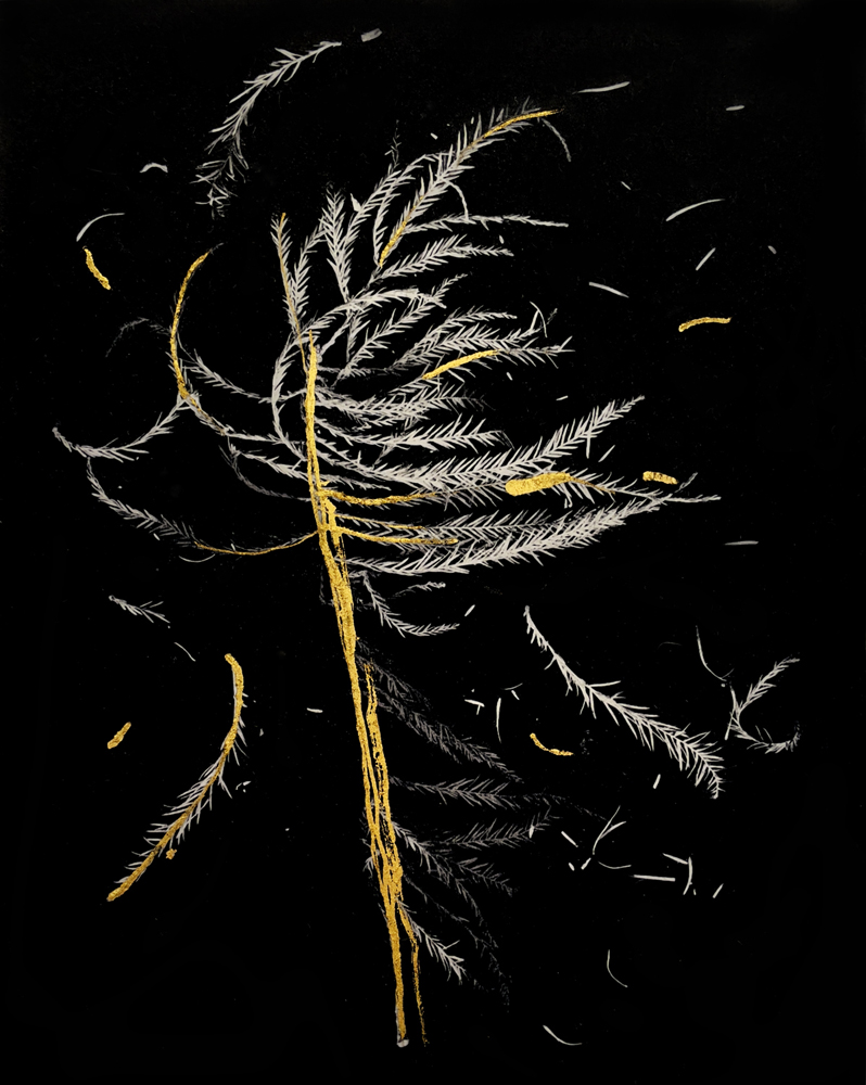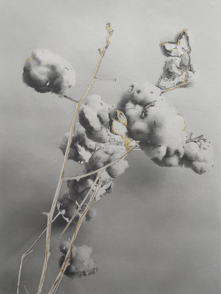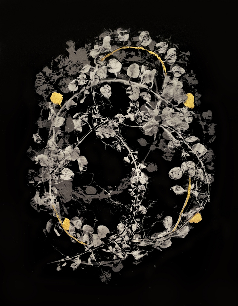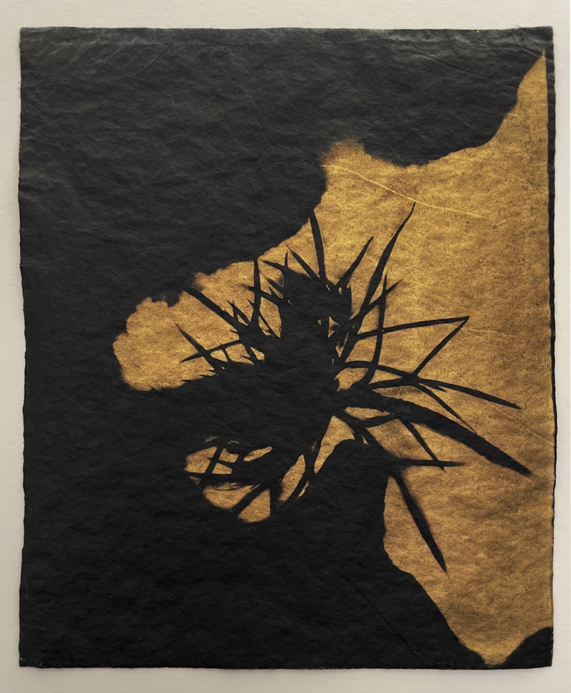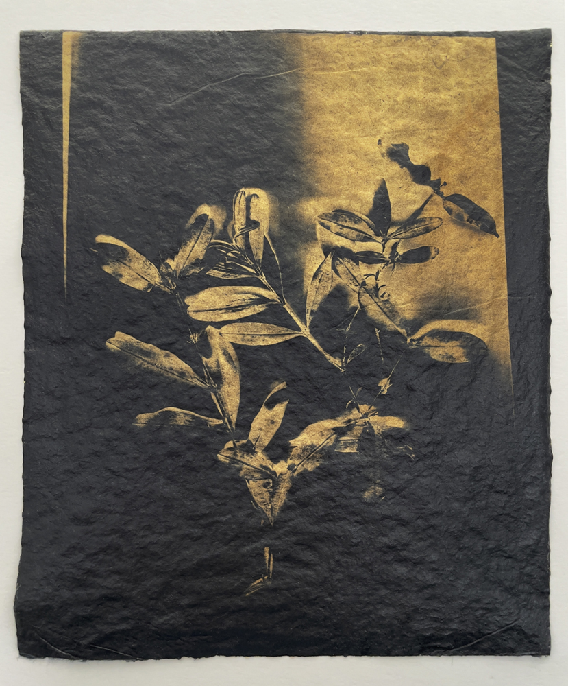 The materials and process for this work were chosen carefully. In chapter 1, the images are printed on Kozo paper, which is known for its delicacy and strength, and that acts as a metaphor for women and this issue. I have applied 24k gold leaf to parts of the prints, which is symbolic of hope, especially for those affected by abortion restrictions. The gold is also a nod to the practice of kintsugi, where gold is used to mend broken ceramics, and is known symbolically for its strength and resilience. In chapter 2, many of the images were created with the phytogram process, a process where the plant chemistry helps create and develop the image, some of the same chemistry that was historically used as part of an abortifacient. The prints were made as inkjet or toned cyanotypes on a delicate washi paper, that are backed with 24k or 18k gold leaf and varnished. The gold again acts as a symbol of hope.