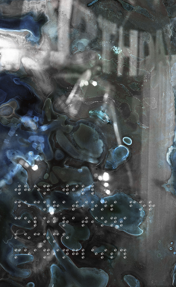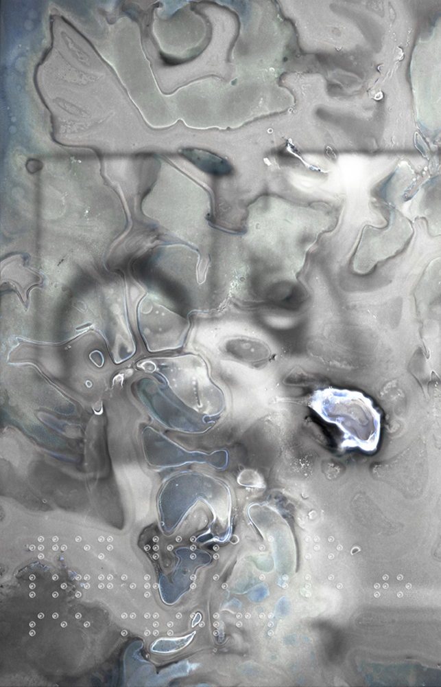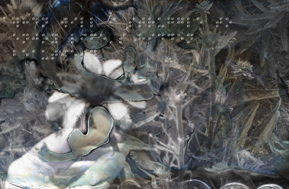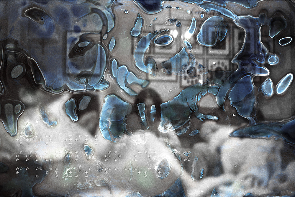Her images appear to disintegrate, layered with fragments of braille that mirror the uncertainty and anxiety surrounding her condition. Through an experimental process, Schneider alters her photographs using medical substances typically associated with healing—antiseptics, eye ointments, even boiling water—transforming them into meditations on decay and irreversible loss.