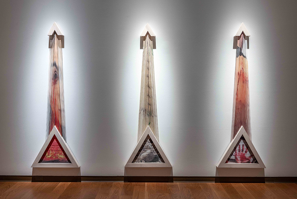 © Mona Bozorgi, Fruits of Defiance: Shoulder, Eyes, Liver, from Threads of Freedom series, 2024, Archival inkjet print on silk (dismantled), 25 x 80 in x 3.