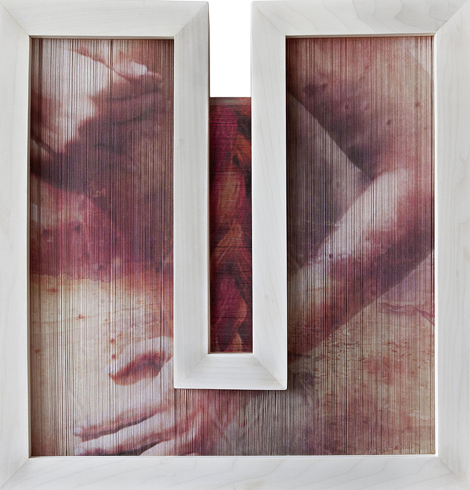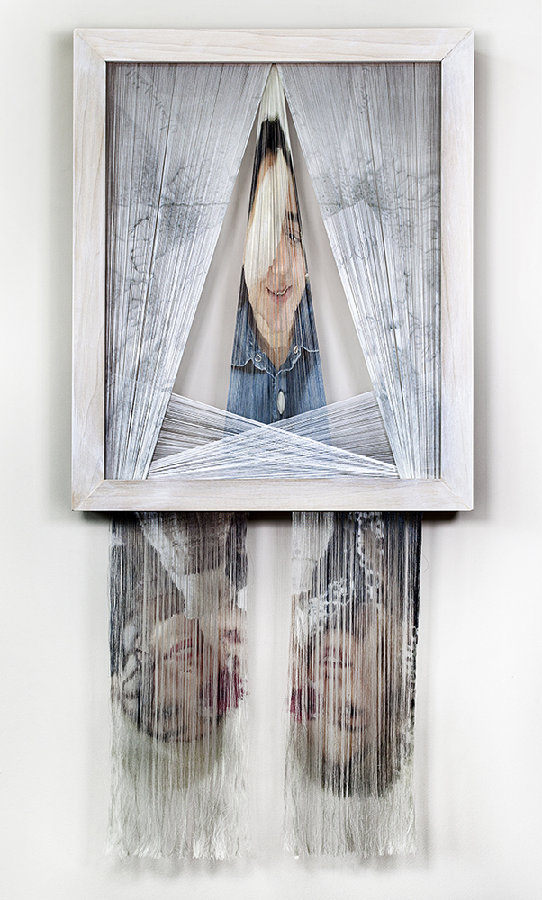 As I mentioned, the history of the materials printed upon contributes to the meaning of the images. Throughout history, women have had a complex relationship with making and consuming fabric. Women were involved in fabric making, particularly spinning fiber, a domestic activity considered feminized and women’s work, regardless of whether it was done by men or women. The complex history of textile production is full of paradoxes that tell stories of civilization, hierarchy, control, and labor. The process of removing threads one at a time by hand in my work is connected to the tradition of spinning threads and a reference to “women’s work”. Fabric is utilized to simultaneously conceal, beautify, and objectify women’s bodies. In Iran, fabric is used to cover women’s bodies and hair, veiling them. Fabric in this project does not cover women’s hair or bodies; instead, it becomes a surface that reveals their bodies, and the threads of those fabrics reweave their shared stories. Seeing the threads elucidates the intra-action between material and images of women, allowing the viewer to simultaneously see both.