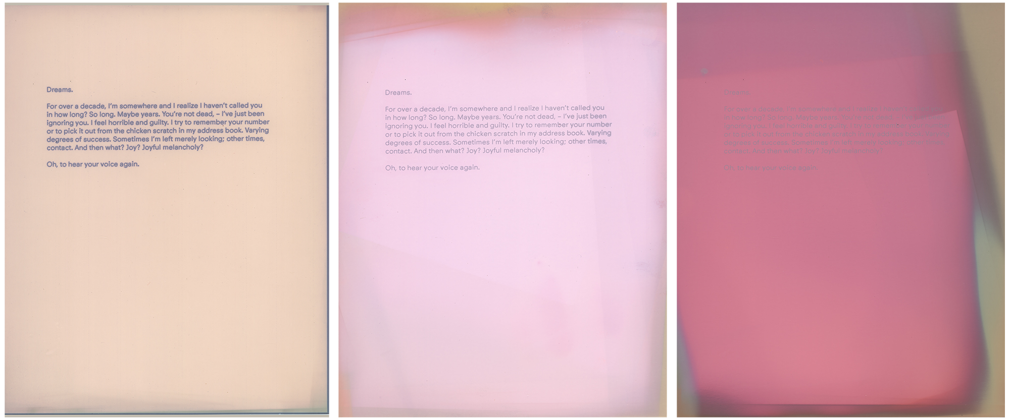 When Ahndraya exhibits this series, her texts are shown as lumen prints. Some prints are fixed – retaining visibility, while others are unfixed, causing the words to “die” over the course of the exhibition. Based on the paper stock and proximity to light, each print dies differently and at a different speed.