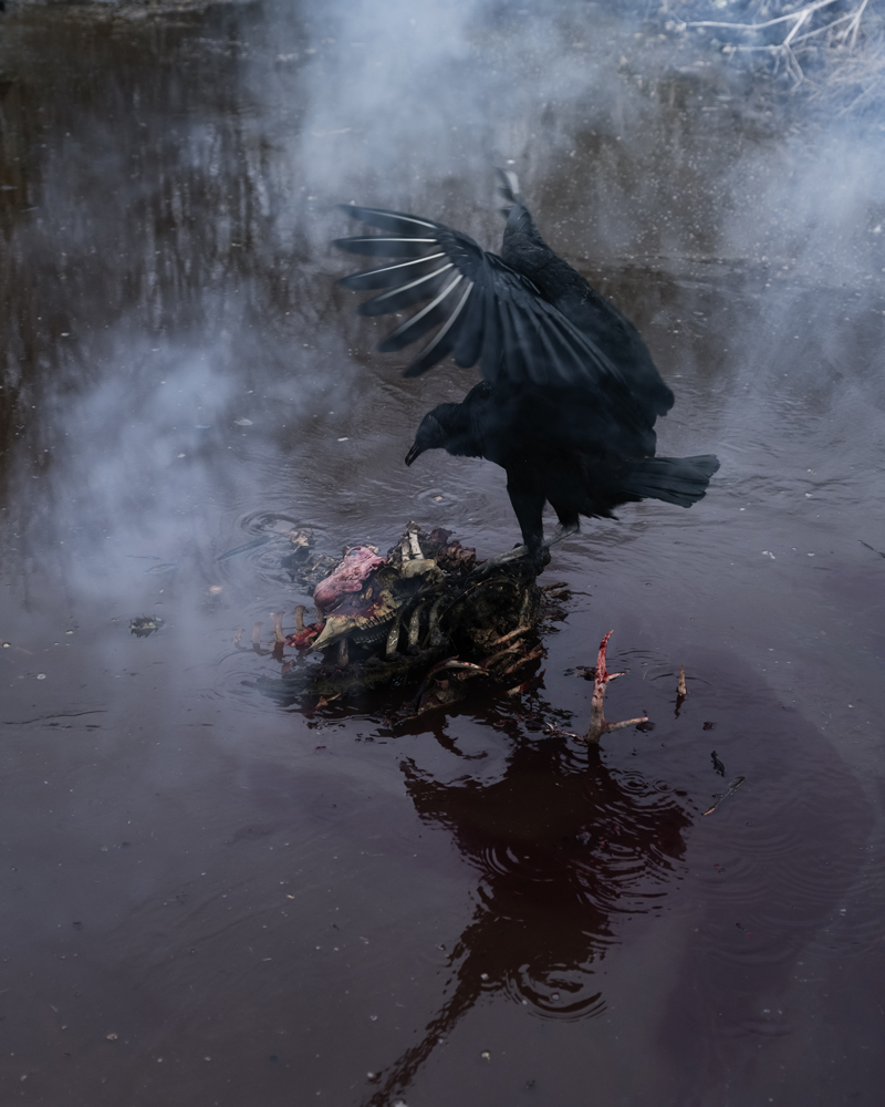 Sometimes, things truly, fully come together. You get a random reward, which isn’t so random, because as you were saying it’s about continually showing up and paying attention. I finally did make a picture and some footage that I totally love. I had brought many of my collected deer skeletons, various forms of meat, blood, etc, and I had carefully picked out some garbage floating in this puddle with a little grabber tool. I had this little mountain of bones and meat in the puddle and the vultures were flying in and eating it. The light came together, and the fog machine…