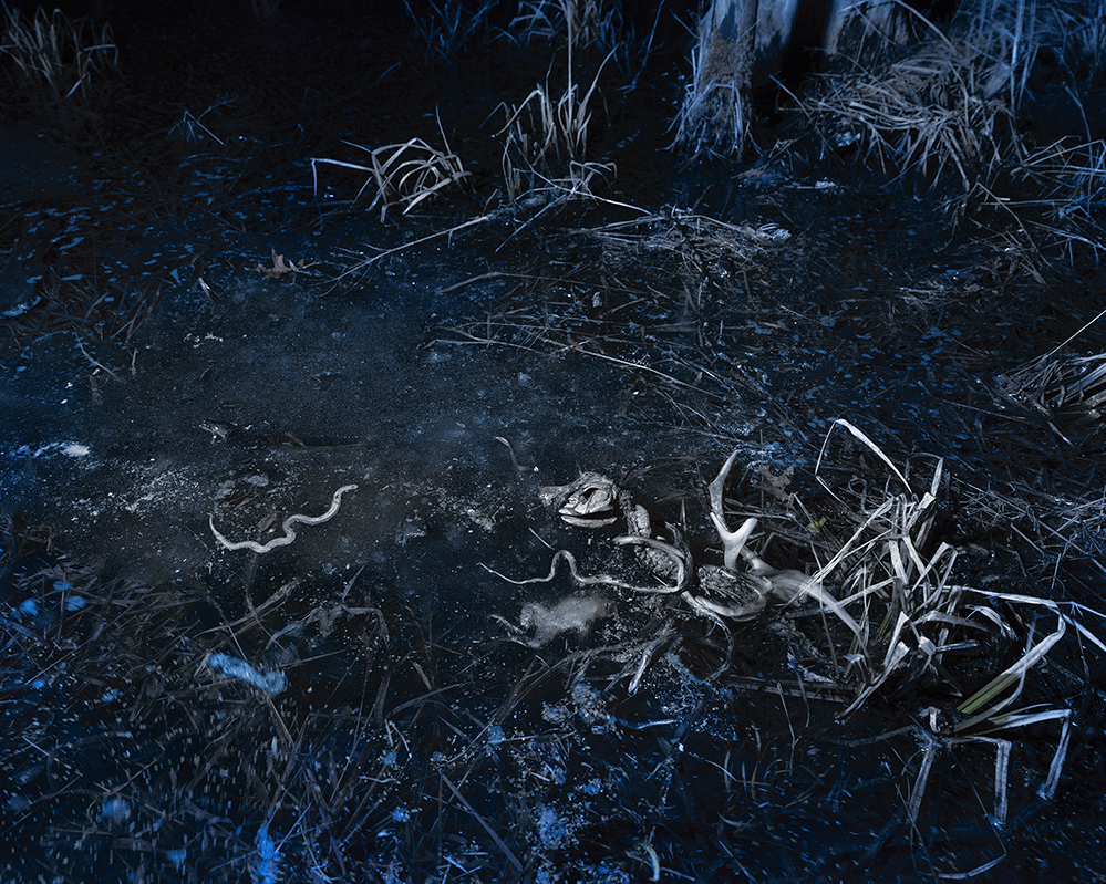 E: I wanted to ask, what is your tolerance for failure? In my work, I avoid this high margin of error by photographing dead and mounted animals that aren’t going to move. What you’re talking about sounds like nature photography, with all that goes into the staging, waiting, and creating frames for the animal to walk into. It sounds like you are taking on some of those technical tropes, but obviously making something that exists in your own, imagined worlds.