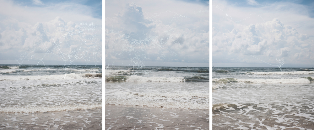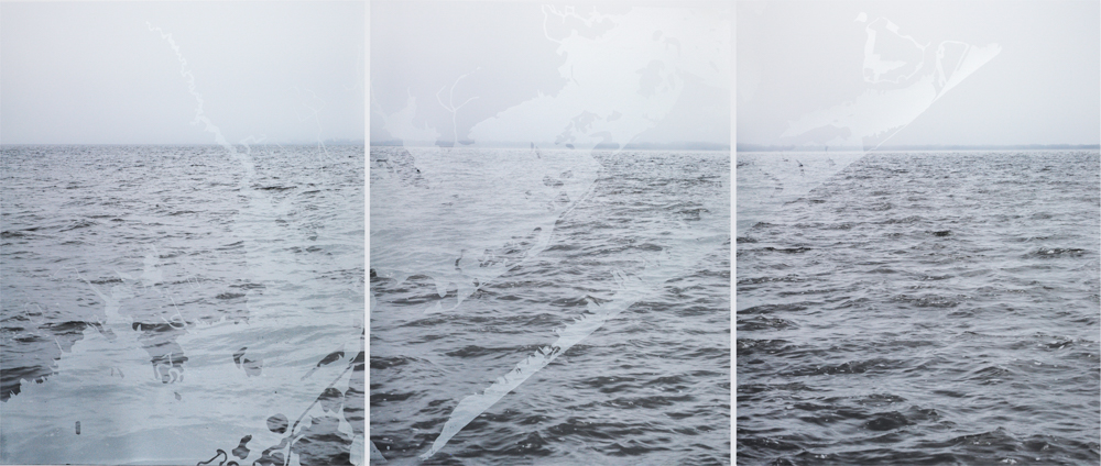 Currently, I am developing ways to visualize concepts that are abstract or invisible, combining data and maps with photographs. For example, one recent piece layers screenprints of projected sea level rise over photographs of Galveston Island. The ink is pearlescent, so the overlay is almost invisible unless light creates a direct reflection from the print’s surface. My intention is to communicate the unseen nature of many threats to the coast and to engage viewers who notice that their perception of the work depends on where they stand in relation to it.