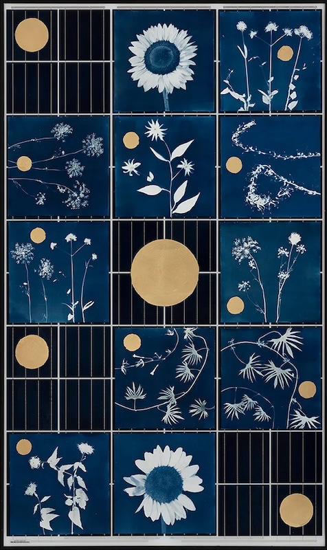 ©Karen Klinedinst, All Flowers In Time Bend Toward The Sun; multiple cyanotypes on paper and gold leaf on solar panel, 40×70″