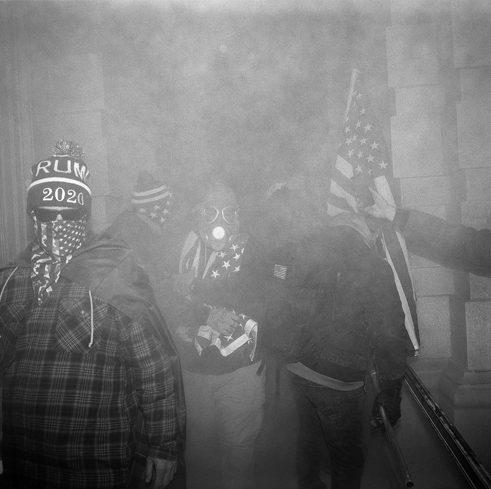 A Pro-Trump mob attacking the U.S. Capitol north entrance in a cloud of tear gas in Washington D.C. on January 6, 2021. (Photo by © Louie Palu/Agence VU)