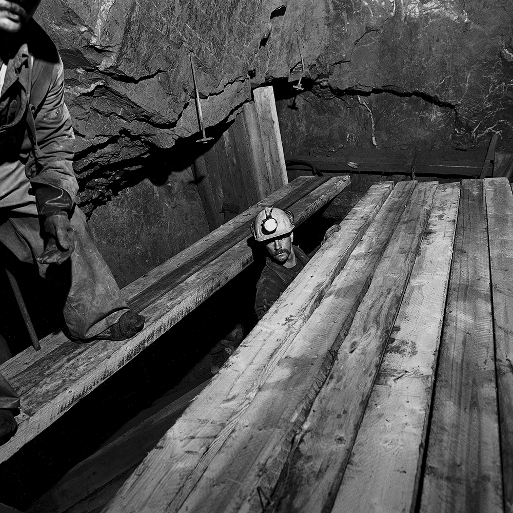 Ralph Schmidt and the late Guy Bruneau timbering a staging for drilling a breast in a shrinkage stope, 1300 foot level, Kerr Mine, Virginiatown, Ontario. From the book Cage Call: Life and Death in the Hard Rock Mining Belt. An in-depth project spanning over 12-years examining communities in one of the richest mining regions in the world located in Northwestern Ontario and Northeastern Quebec in Canada. (Photo by © Louie Palu/Agence VU)