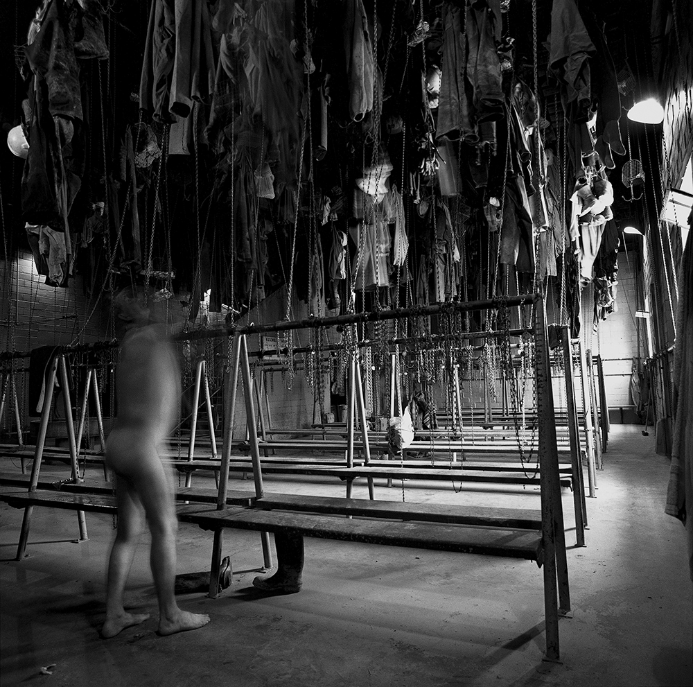 A miner in the Dry hanging his work clothes in the air to dry after shift, Kerr Mine, Virginiatown, Ontario. From the book Cage Call: Life and Death in the Hard Rock Mining Belt. An in-depth project spanning over 12-years examining communities in one of the richest mining regions in the world located in Northwestern Ontario and Northeastern Quebec in Canada. (Photo by © Louie Palu/Agence VU)