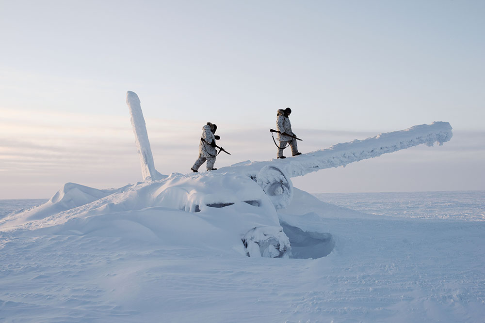 Canadian soldiers on reconnaissance walk on the wreckage of an airplane outside Resolute Bay in Nunavut, Canada. (Photo by © Louie Palu/Agence VU)