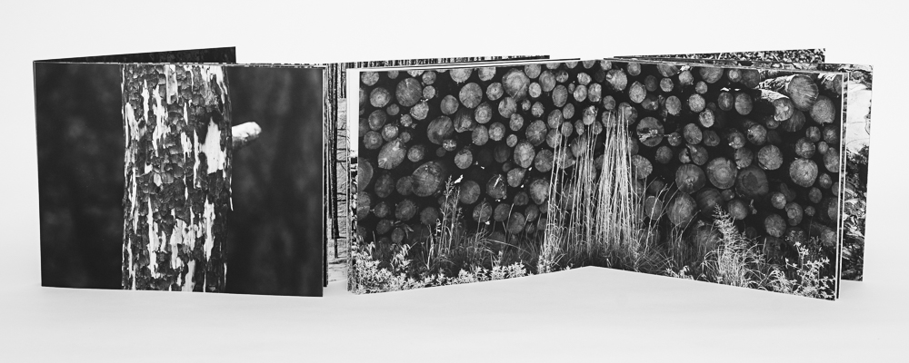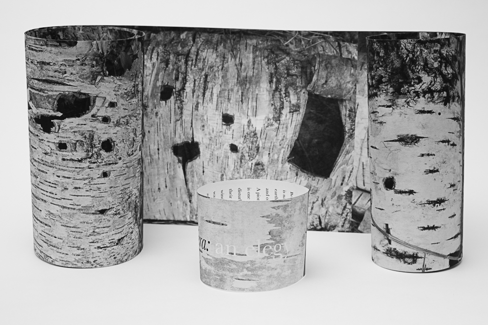 ©Dana Fritz, Betula papyrifera: an elegy, (2022, hand bound artist book,) takes the form of a scroll in which photographs of decaying, hollow birch trees are unfurled by a viewer. Paper birch trees have relatively short life spans but decompose slowly on the forest floor. Long after the inner wood has been recycled by insects and fungi, their water-resistant bark skins remain as hollow horizontal forms, vestiges of a bygone climate.