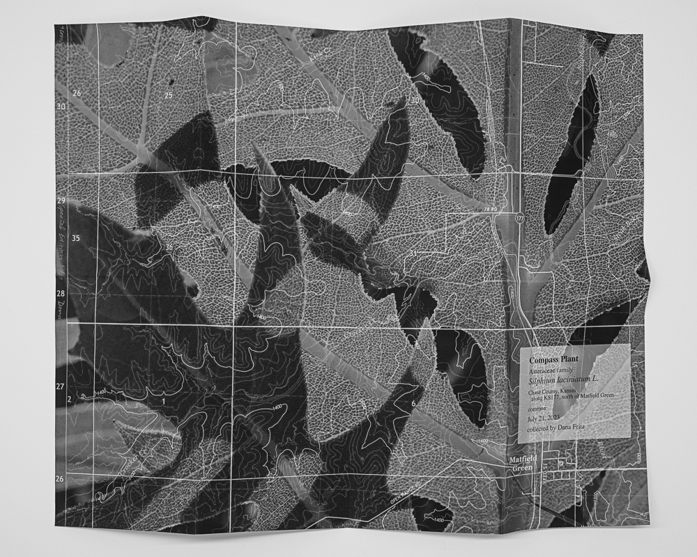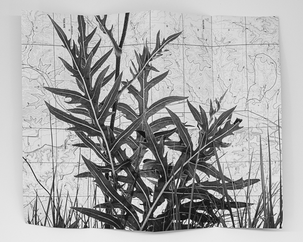 Compass Plant/Map, (2023, artist book,) is inspired by Silphium laciniatum’s flat vertical map-like leaves that point north and south but face east and west. Photographs of their flat, planar leaves are layered with a topographic map of the collection site with topographic lines that resemble the shape of compass plant leaves. The outside includes text prepared as if it were an herbarium specimen, including the collector and the site of collection.