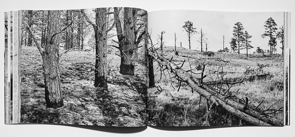 Post-fire Postscript (2024, hand bound artist book) follows the changes in land after a catastrophic wildfire swept through the hand-planted forest and grasslands. Over two years I photographed in the evolving fire scar and eventual clearcut and timber sale to create an artist book that acts as a companion and update to my trade book.
