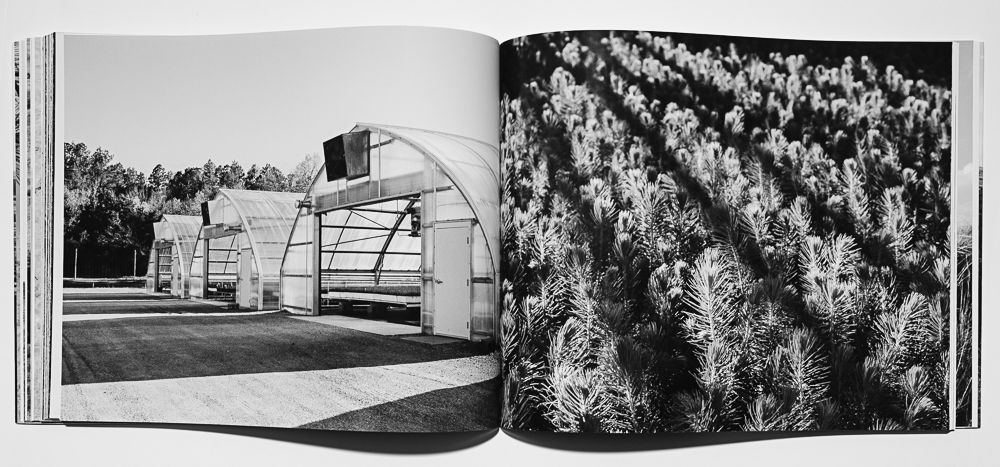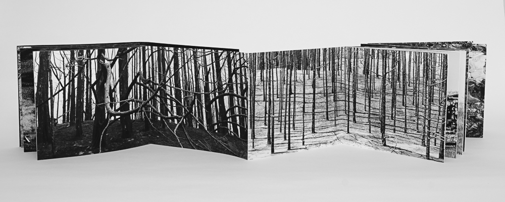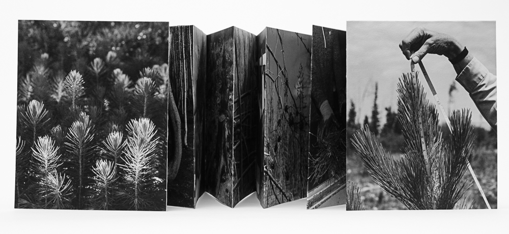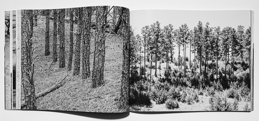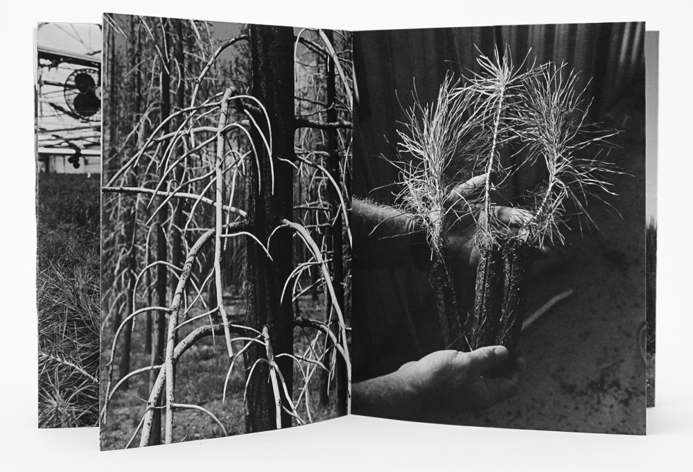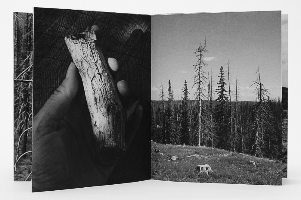 Re: forest, (2022, hand bound artist book,) follows the circular path from Nebraska’s Bessey Nursery to where seedlings are planted in Pike, Roosevelt, and Medicine Bow National Forest areas in Colorado and Wyoming that have suffered catastrophic wildfire and beetle infestations. The photographs loop from the nursery to the forests and back, reminding us that we are inextricably part of this process and that our work to maintain forests is ongoing.