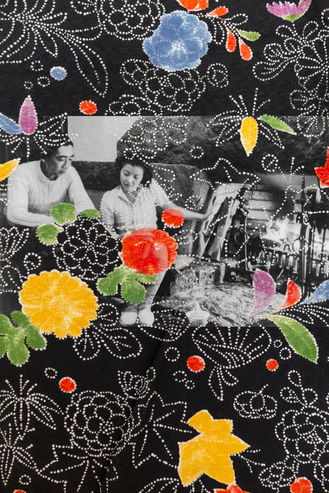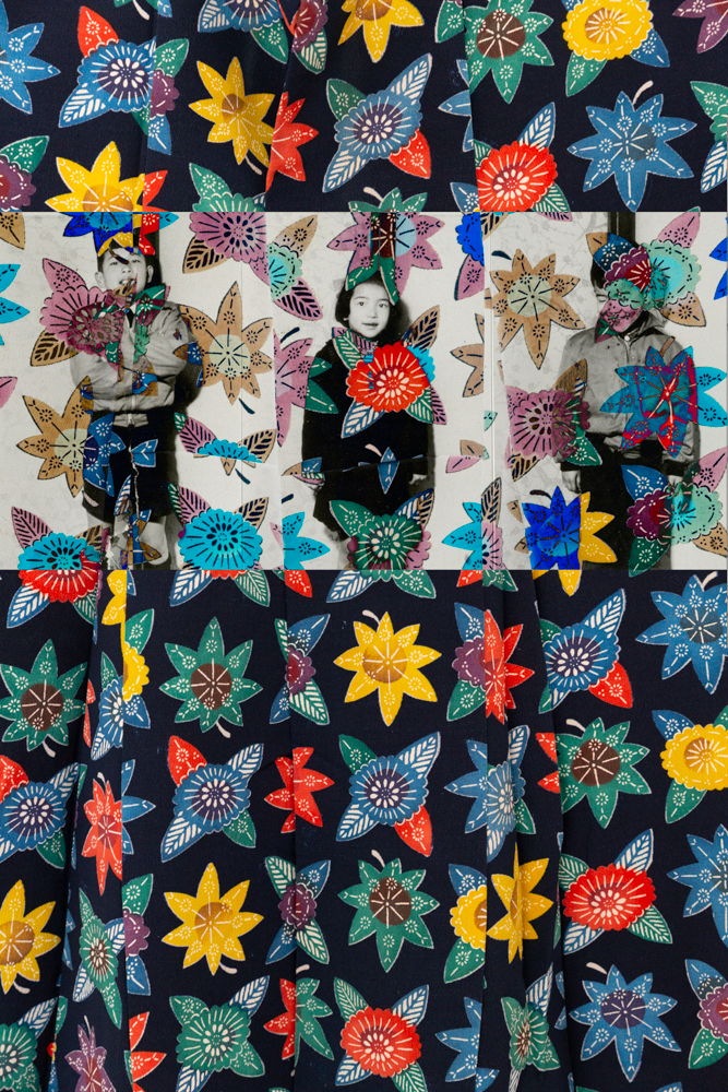 My image-making process involves photographing the kimonos during mushiboshi, a tradition of airing the delicate fabric during the dry months. The garments are photographed in natural light and merged with scanned archival photographs. In layering photographs and textiles, I aim to visualize the layers of time and meaning we carry within us.