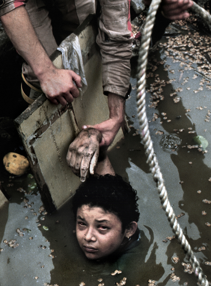 ©Carol Guzy, “FINAL MOMENTS” MUDSLIDE IN COLUMBIA Omayra Sanchez looks up from her watery grave. The 13 year old girl was trapped in the mudslide which covered her town of Armero Columbia, killing more than 25,000 people. Although rescuers tried to free her, they were unsuccessful. After 59 hours she died, becoming a sad symbol of the devastating tragedy. Photo by Carol Guzy/ Miami Herald/ Armero Columbia 1985