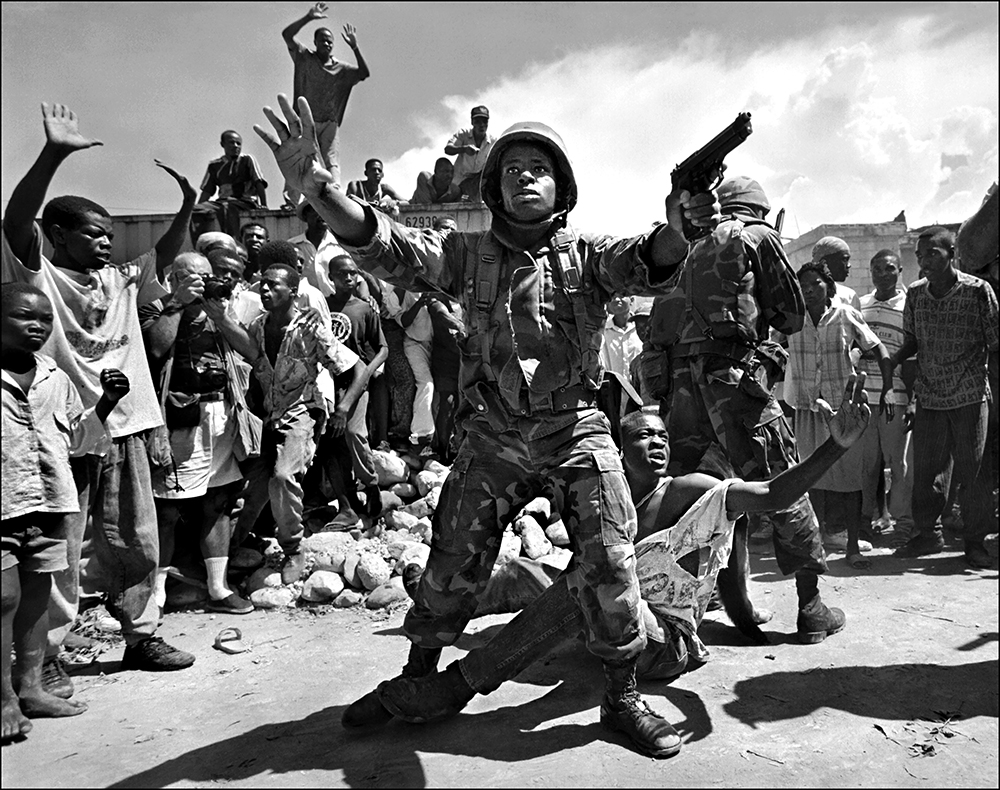 ©Carol Guzy, INTERVENTION Shortly after the military intervention of Haiti, a U.S. soldier steps in to protect a man suspected of throwing a grenade into a joyous democracy march, killing and injuring numerous pro-Aristide demonstrators in yet another act of intimidation by para-military thugs. The soldiers arrested him, saving his life from an angry and bitter crowd looking for justice after many years of repression. Port-au-Prince, Haiti 1994