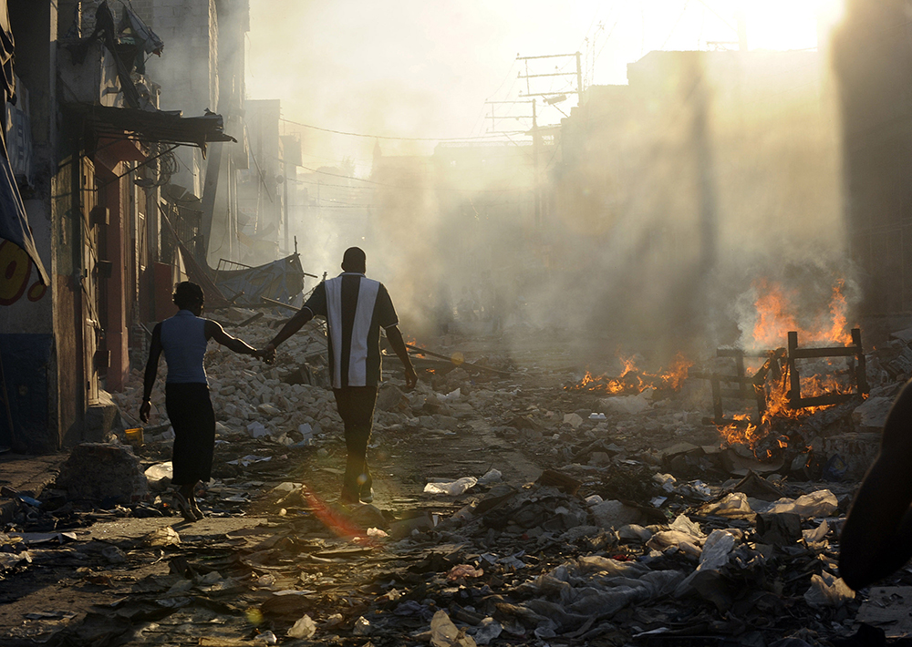 ©Carol Guzy, A couple walks past as Haitians burn debris from the earthquake devastation in Port-au-Prince as people take goods from destroyed stores in the marketplace.