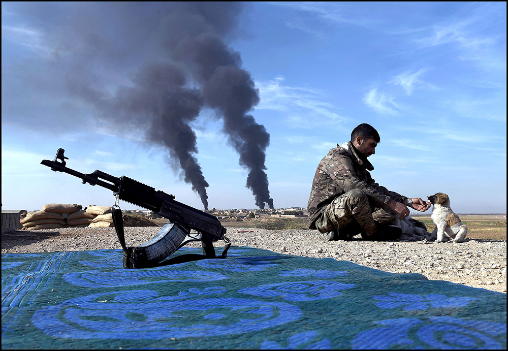 ©Carol Guzy, Syrian Kurdish YPG soldiers care for puppies at a checkpoint on the road to Tel Tamir, Syria on November 12, 2019. Smoke from burning oil is used as a shield from drones and airstrikes. Fierce conflict waged after U.S. President Donald Trump pulled troops out which was viewed by many as a betrayal of Kurdish allies.