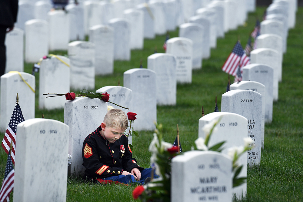 Christian Jacobs, 7, sits against the headstone of his father, U.S. Marine Corps Sgt. Christopher James Jacobs as he visits in observance of Memorial Day at Arlington National Cemetery on Monday May 28, 2018 in Arlington, VA. Christopher died during a training exercise in 2011.(Photo by Matt McClain/The Washington Post)