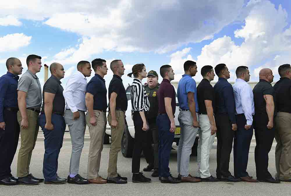Erin Herrgott, 20, of Oxford, MI, center, is talked to by instructor, Howard Parsons after arriving with other new trainees at the United States Border Patrol Academy on Wednesday August 29, 2018 in Artesia, NM. The academy is on the grounds of the Federal Law Enforcement Training Center. (Photo by Matt McClain/The Washington Post)