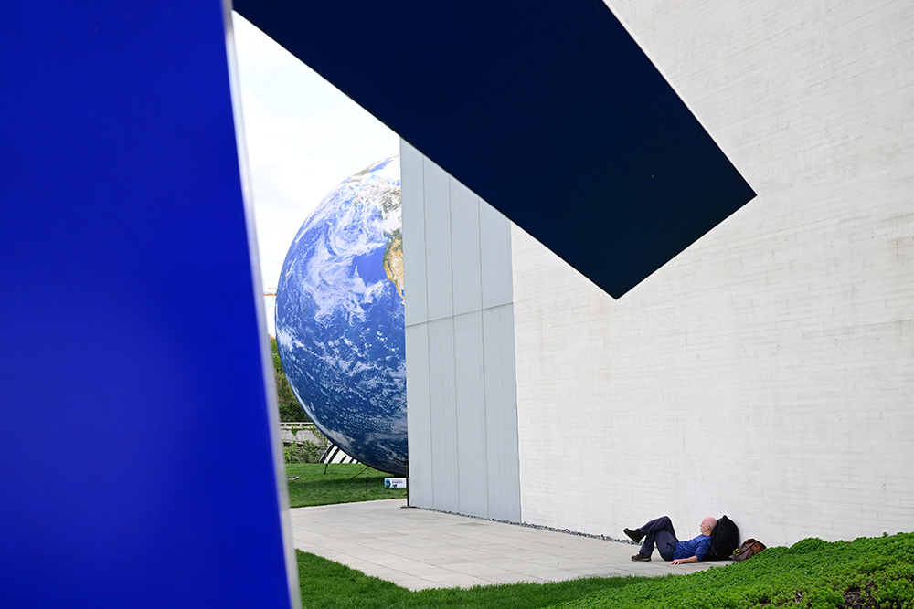 A man, who identified himself as “Doc” rests in the shade as an inflatable Earth that is part of the exhibit entitled, “Celestial Bodies: Earth, Moon, Mars is seen at the REACH at the Kennedy Center for the Performing Arts on Tuesday April 22, 2025 in Washington, DC. Tuesday was Earth Day. (Photo by Matt McClain/The Washington Post)