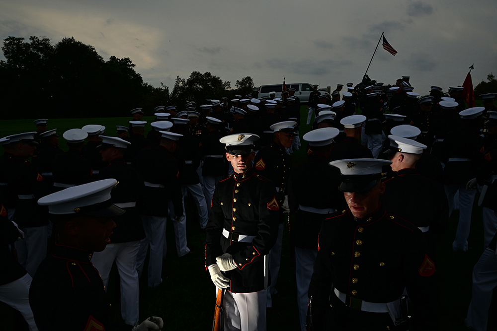 U.S. Marine Corps Lance Corp. Ivan Matteson, center, gathers with others for the Tuesday Sunset Parade at the United States Marine Corps War Memorial on Tuesday July 29, 2025 in Arlington, VA. The parade featured “The Commandant’s Own”, United States Marine Drum and Bugle Corps along with the United States Marine Corps Silent Drill Platoon. Next Tuesday August 5th will be the last event of the summer season. (Photo by Matt McClain/The Washington Post)
