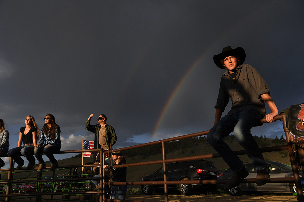 Zach Cardwell, right, watches the Flying Heels Rodeo as a rainbow streaks across the sky as a storm passes through on Saturday July 03, 2021 in Granby, CO. The Colorado River passes through the area and has it’s headwaters in Rocky Mountain National Park. (Photo by Matt McClain/The Washington Post)