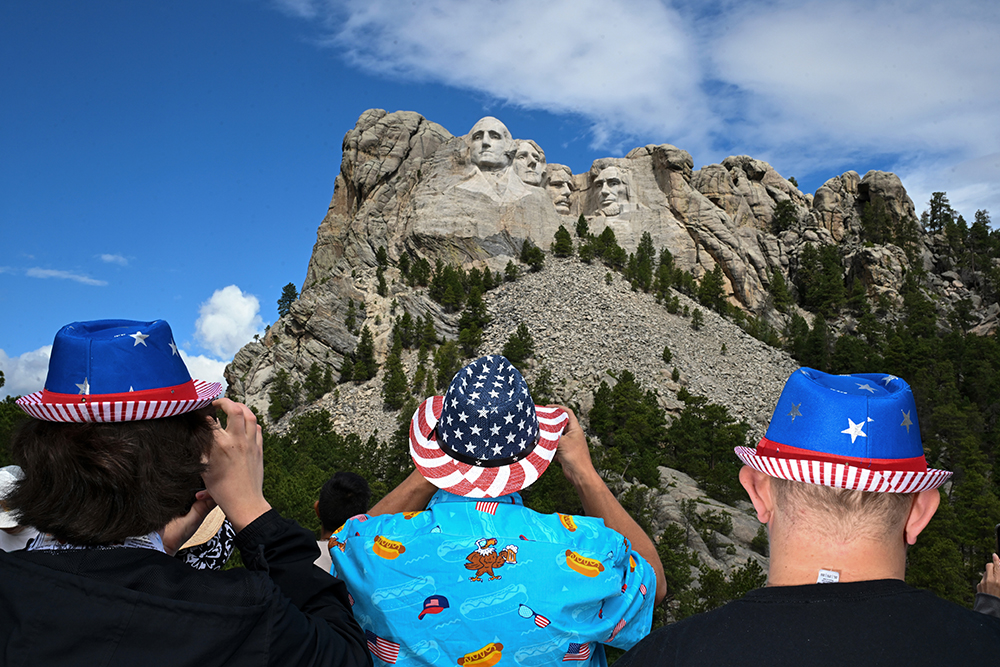 Bill Niarhos, center, of Bark River, MI and others wear patriotic hats to celebrate the 4th of July at Mount Rushmore National Memorial on Thursday July 04, 2024 in Keystoe, SD. The monument celebrated the holiday by having historical interpreters of each of the four presidents represented in stone. (Photo by Matt McClain/ The Washington Post)