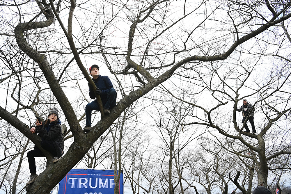 Supporters of President Donald Trump take to the trees for a view as they gather for the Save America March event that stretched from the White House to the Washington Monument on Wednesday January 06, 2021 in Washington, DC. Pro-Trump supporters were gathering to protest last November’s election results. President Trump spoke at the event. The U.S. Capitol was later breached by supporters. (Photo by Matt McClain/The Washington Post)