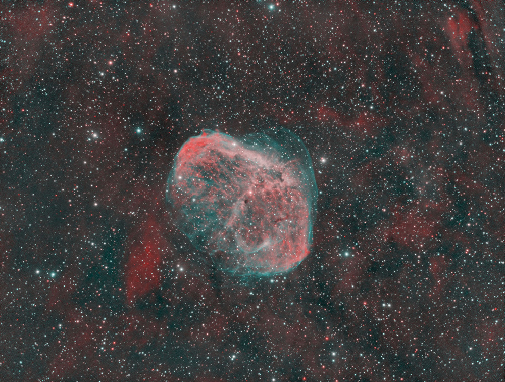 I approach color a little differently for narrowband images. These images are photographed with specific filters for each of three gasses. I often use the Hubble palette, which maps sulfur to red, hydrogen to green, and oxygen to blue. The reality is that hydrogen is by far the dominant gas. This method allows me to see each of the gasses separately.