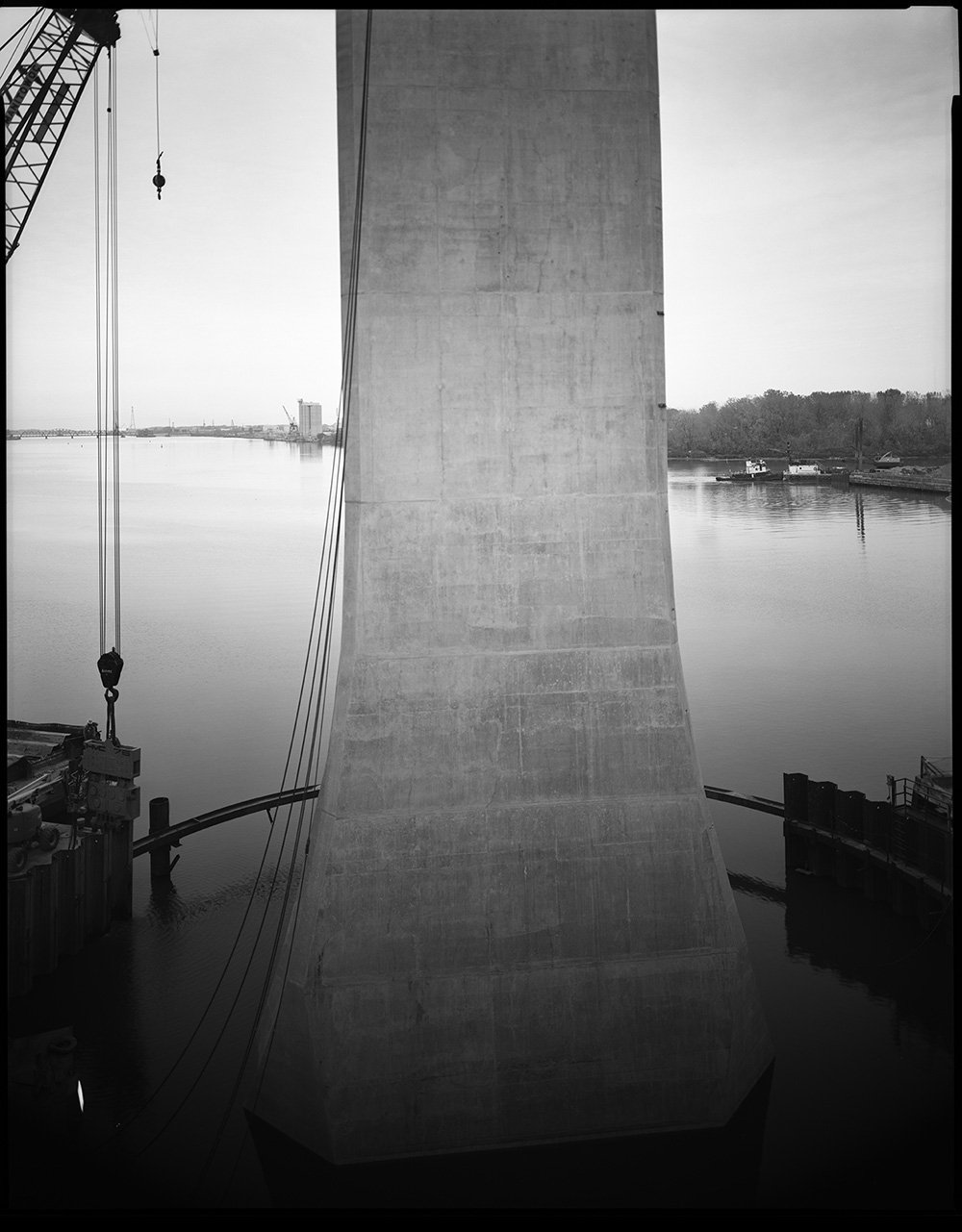 The bridge project came from a different part of me. In 2003, I was commissioned by the Toledo Museum of Art (TMA) to photograph the FIGG designed I-280 bridge construction now known as the Veterans Glass City Skyway (Figs. 9, 10, 11). Here was a chance to honor some of my other heroes from the history of photography: Lewis Hine, Berenice Abbott, and Walker Evans. Using the 8×10, I initially had access to the construction site wearing a hard hat, boots, and a yellow vest. Then there was a terrible accident (not near me) and some workers died and new restrictions were imposed. The new restrictions were a good thing. I was assigned an escort who was great, but, of course, another person that I worried about. I asked myself: Was she okay? And, was what I was doing okay? In the end, the portfolio consisted of 20 x 24-inch gelatin silver prints, 26 in number, and all housed in the TMA’s wonderful collection. The Assistant Curator of Contemporary Art, Jehan Mullin, recently found them and has given them space (three at a time) in one of the galleries, which has made me very happy.