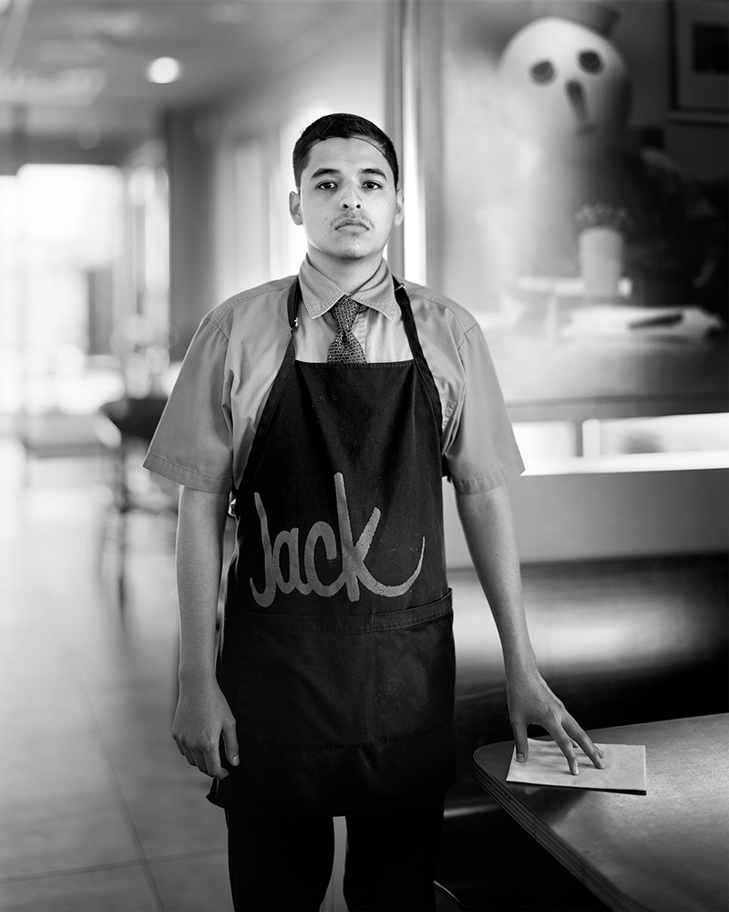 In 2012 in New York City, a group of fast-food workers launched what became known as the Fight for $15, a broad social movement demanding a minimum wage of $15 per hour and the right to unionize—a response to decades of stagnating wages and widespread economic inequality in the U.S. As that movement gained national prominence, and as my sympathies lay with the workers being exploited by large fast-food corporations and franchises, it became clear that the moment was right to pursue my idea more seriously. I began the project on a photographic trip to South Texas in 2019, where I made the portrait of Ivan at Jack in the Box. I had the sense that these workers needed to be photographed in black and white—so their individuality could come through, unmediated by the corporate branding.
