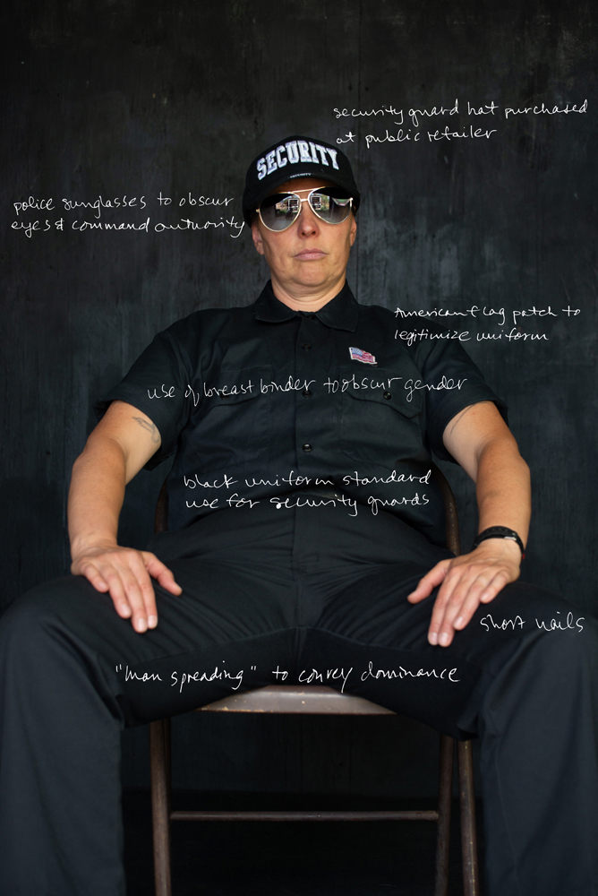 ©jessamyn lovell, Guardia de Seguridad para el Pueblo (AKA: Security Guard), 2021 Security Guard aims to obscure my gender and identity altogether to become a faceless, nameless security guard. This is both a persona and a disguise developed during my training with international performance troupe La Pocha Nostra from 2016-2018. I have used Security Guard in multiple public performances since. I have used this disguise to perform actual security services to a cannabis farm.
